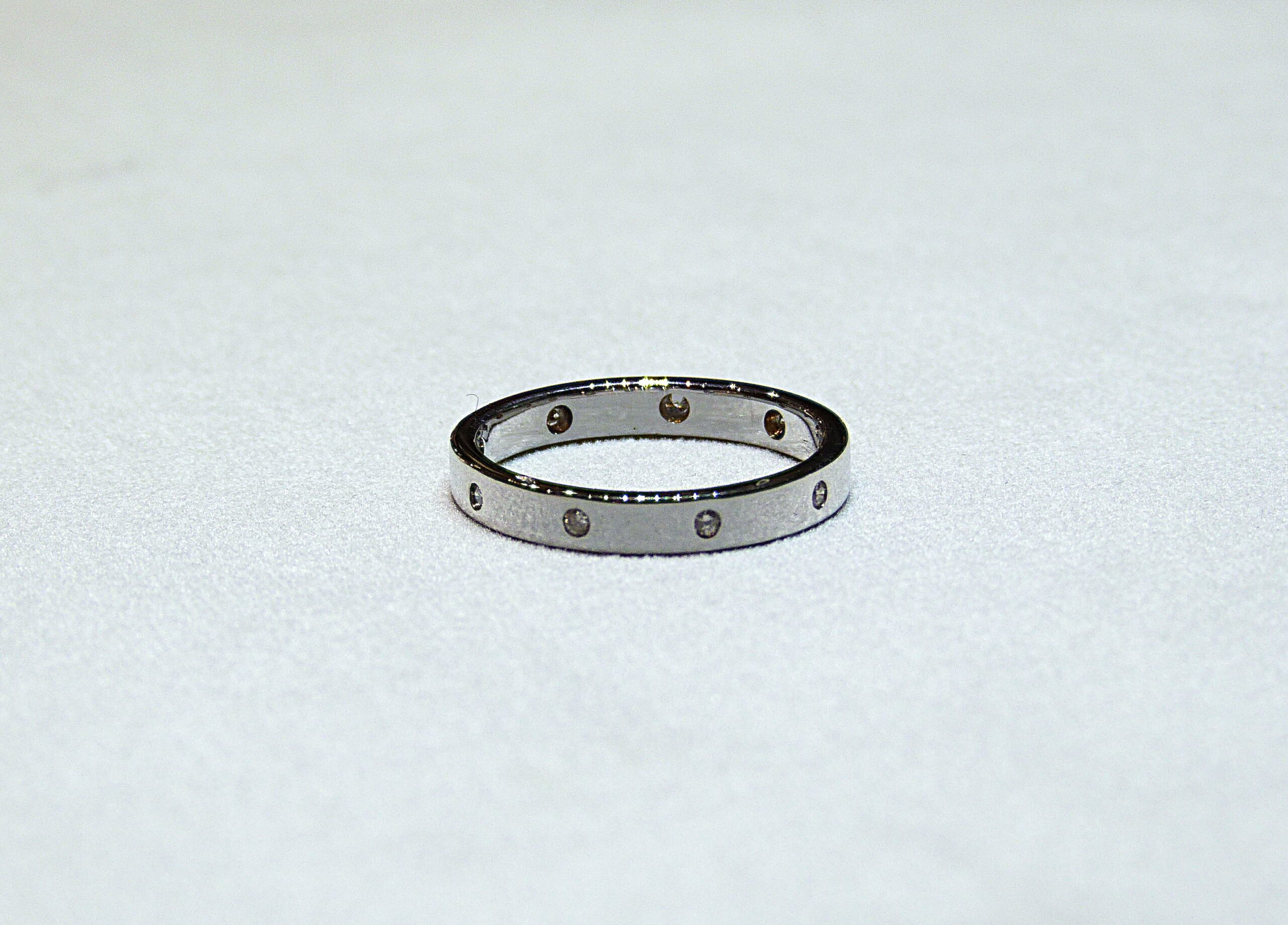 Alliance en or gris 750/1000ème ( 18 k ) sertie partiellement de diamants taille brillant pesant ensemble 0,15 carat environ.