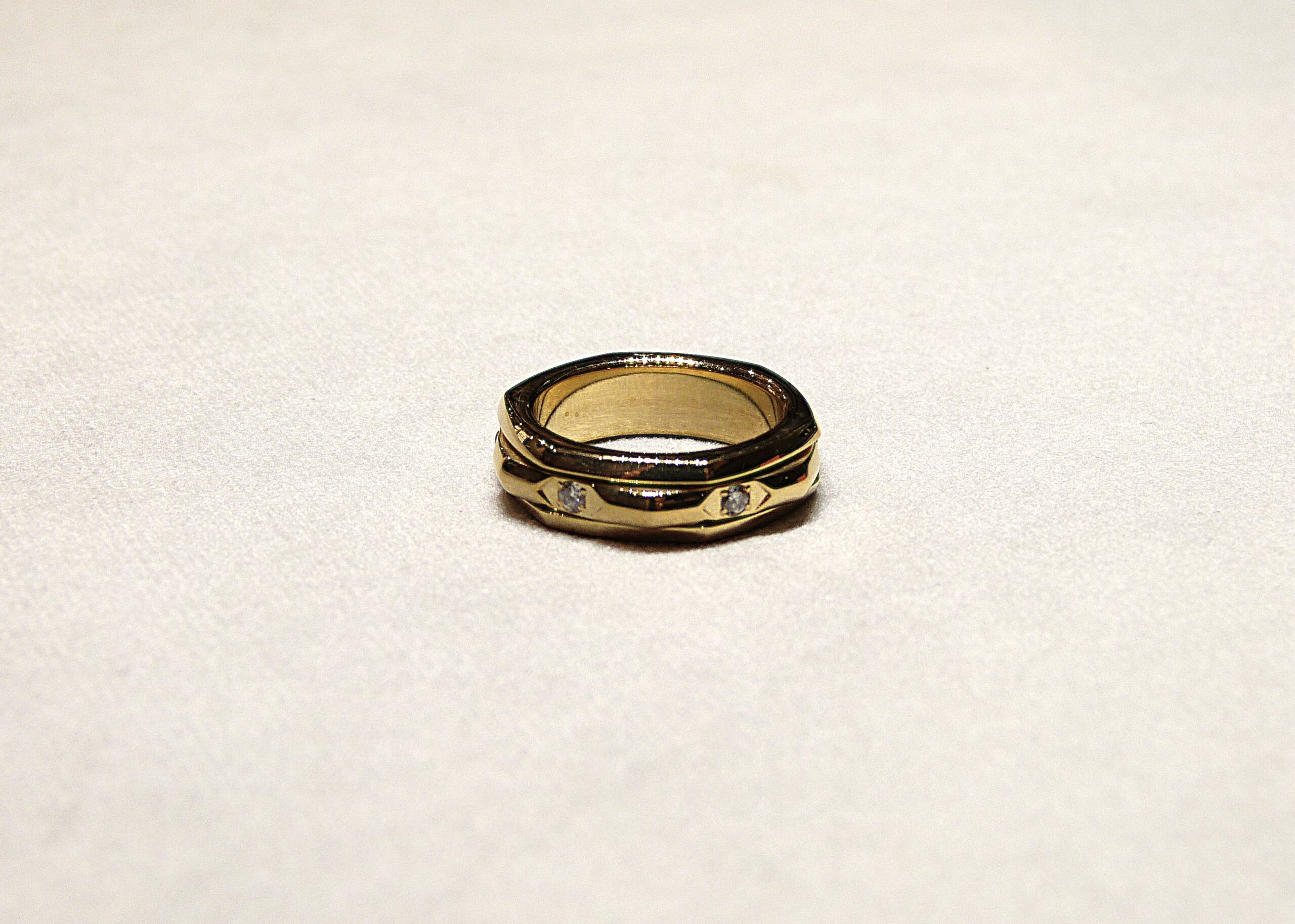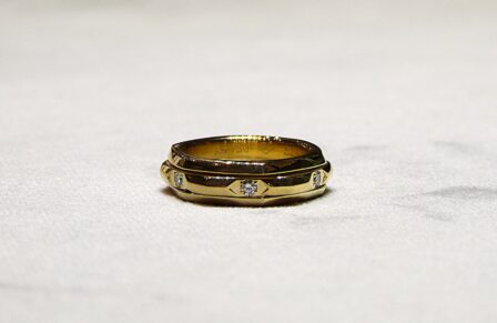Bague composée d’un anneau mobile de forme hexagonale en or jaune 750/1000ème ( 18 k ) partiellement serti de diamants taille brillant pesant ensemble 0,24 carat.