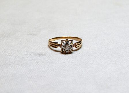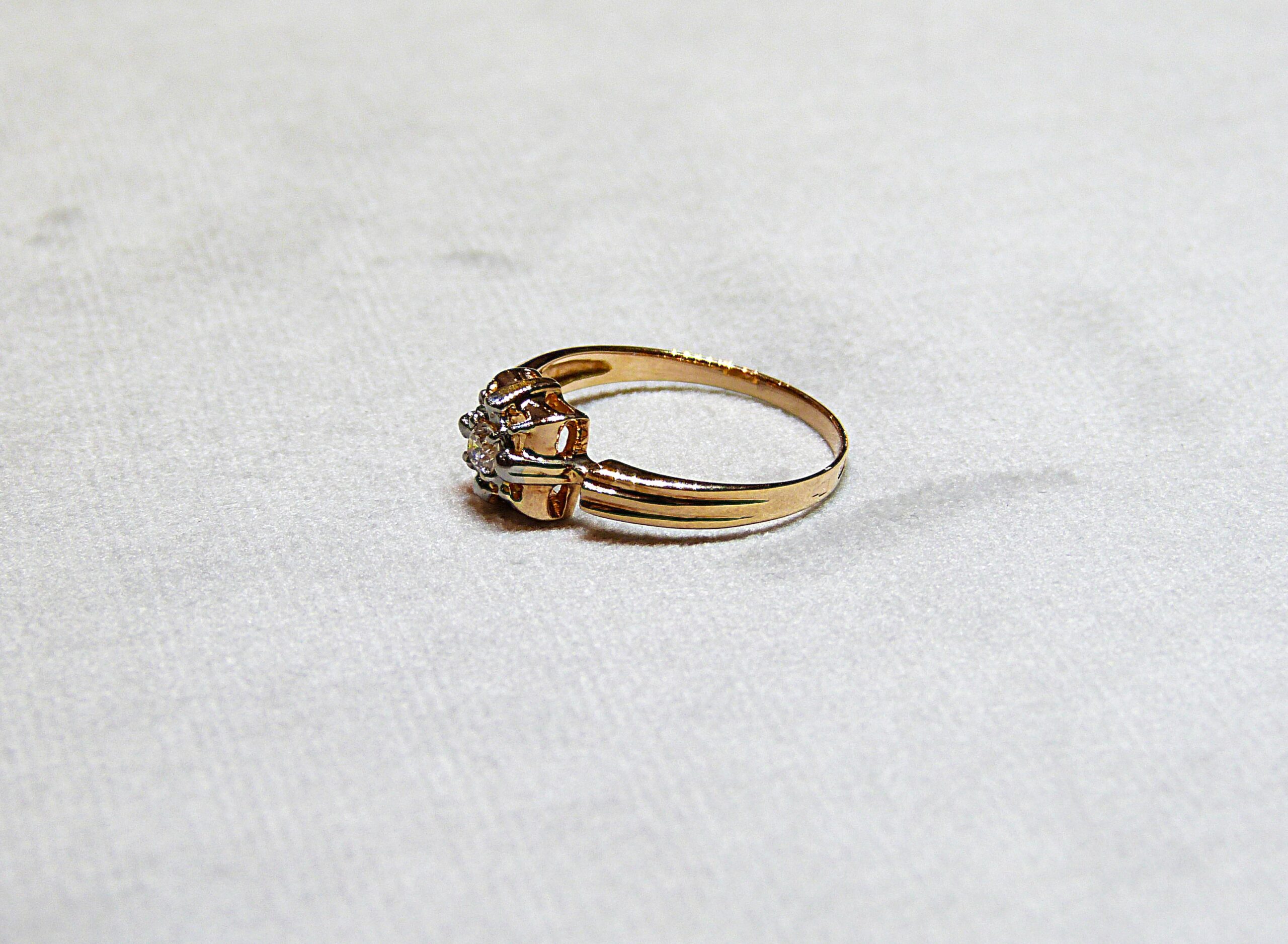 Bague de type solitaire en or 585/1000ème ( 14 k ) bicolore sertie d’un diamant taille brillant d’environ 0,10 carat.
