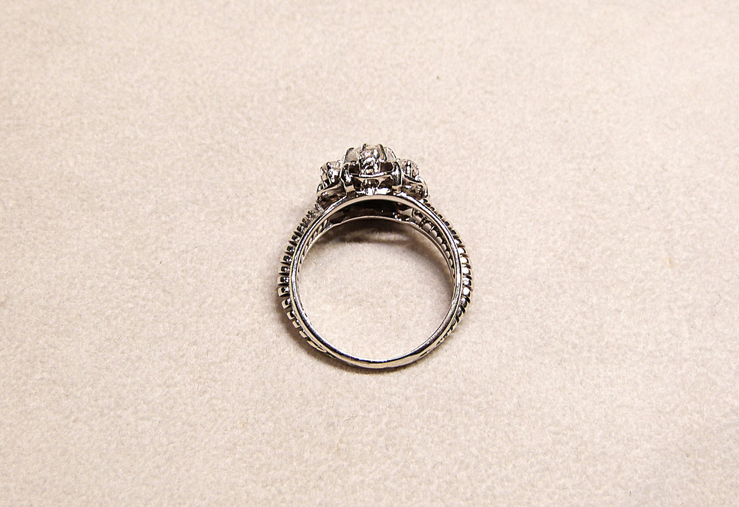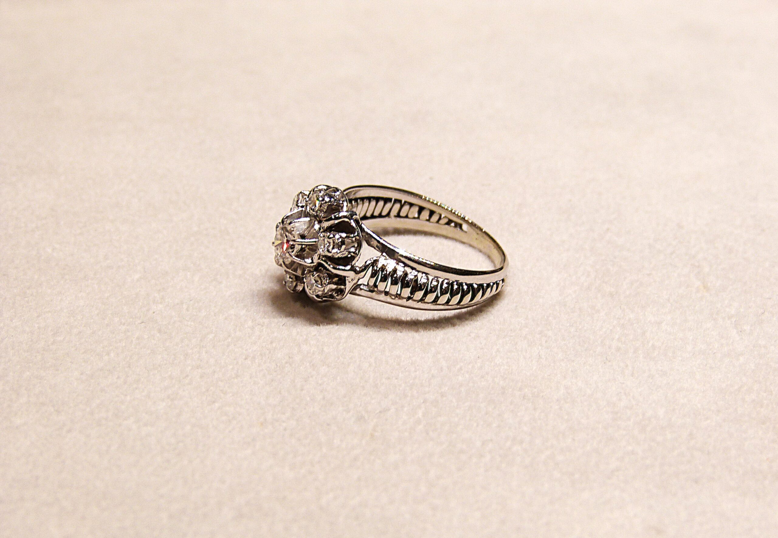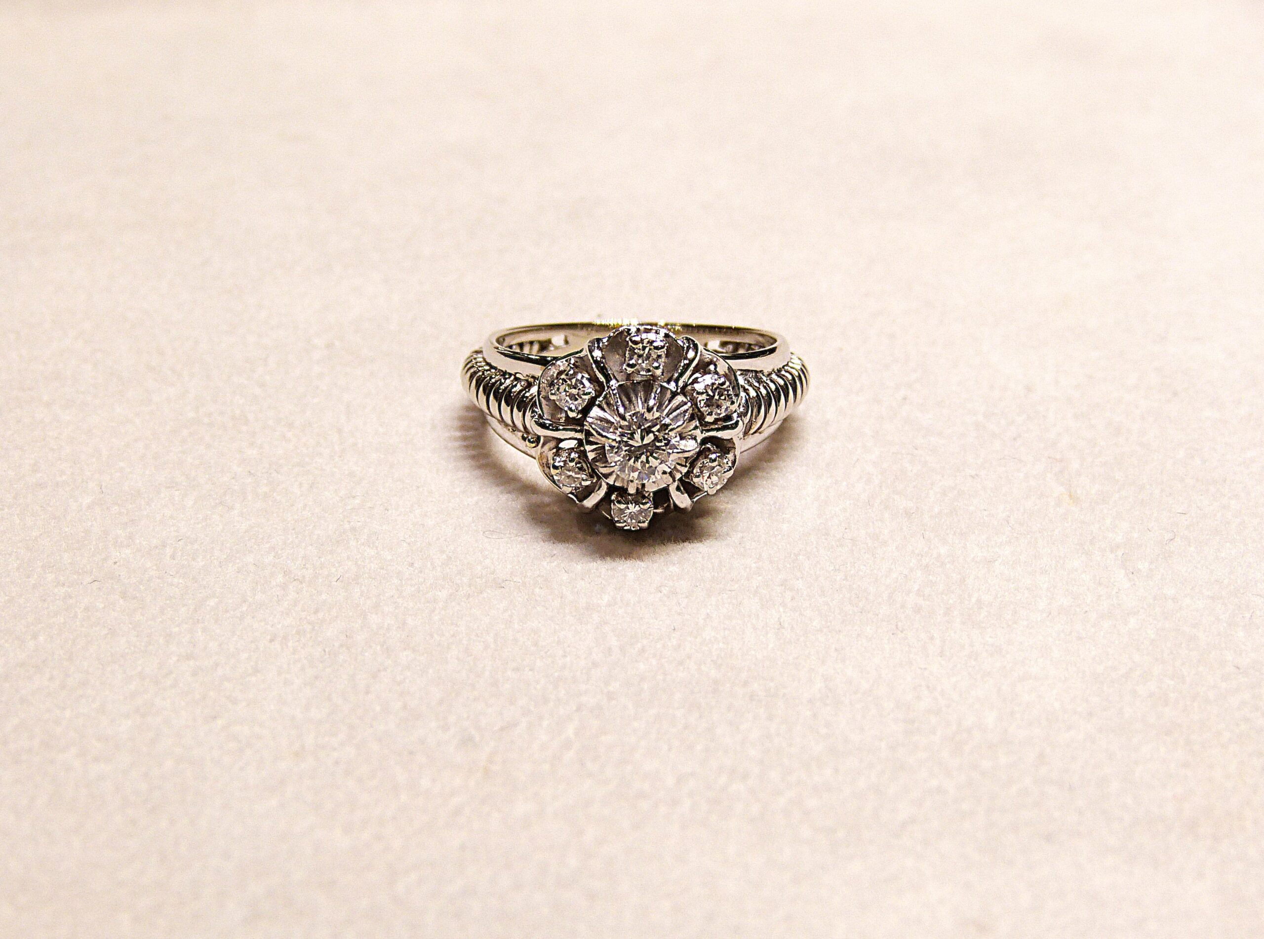 Bague en or gris 750/1000ème ( 18n k ) sertie en son centre d’un diamant taille brillant d’environ 0,30 carat épaulé de petits diamants taille brillant pesant ensemble 0,18 carat environ.