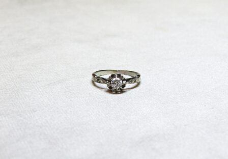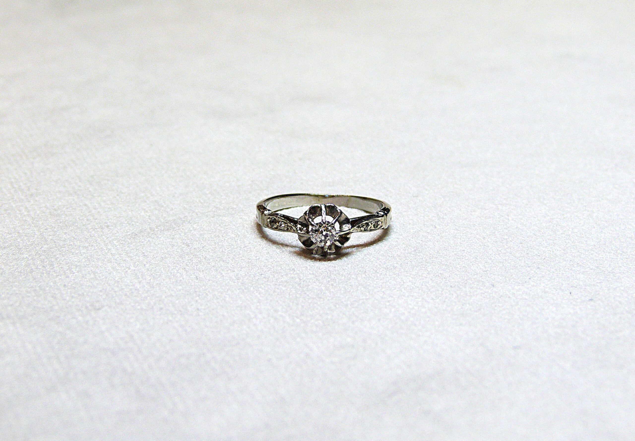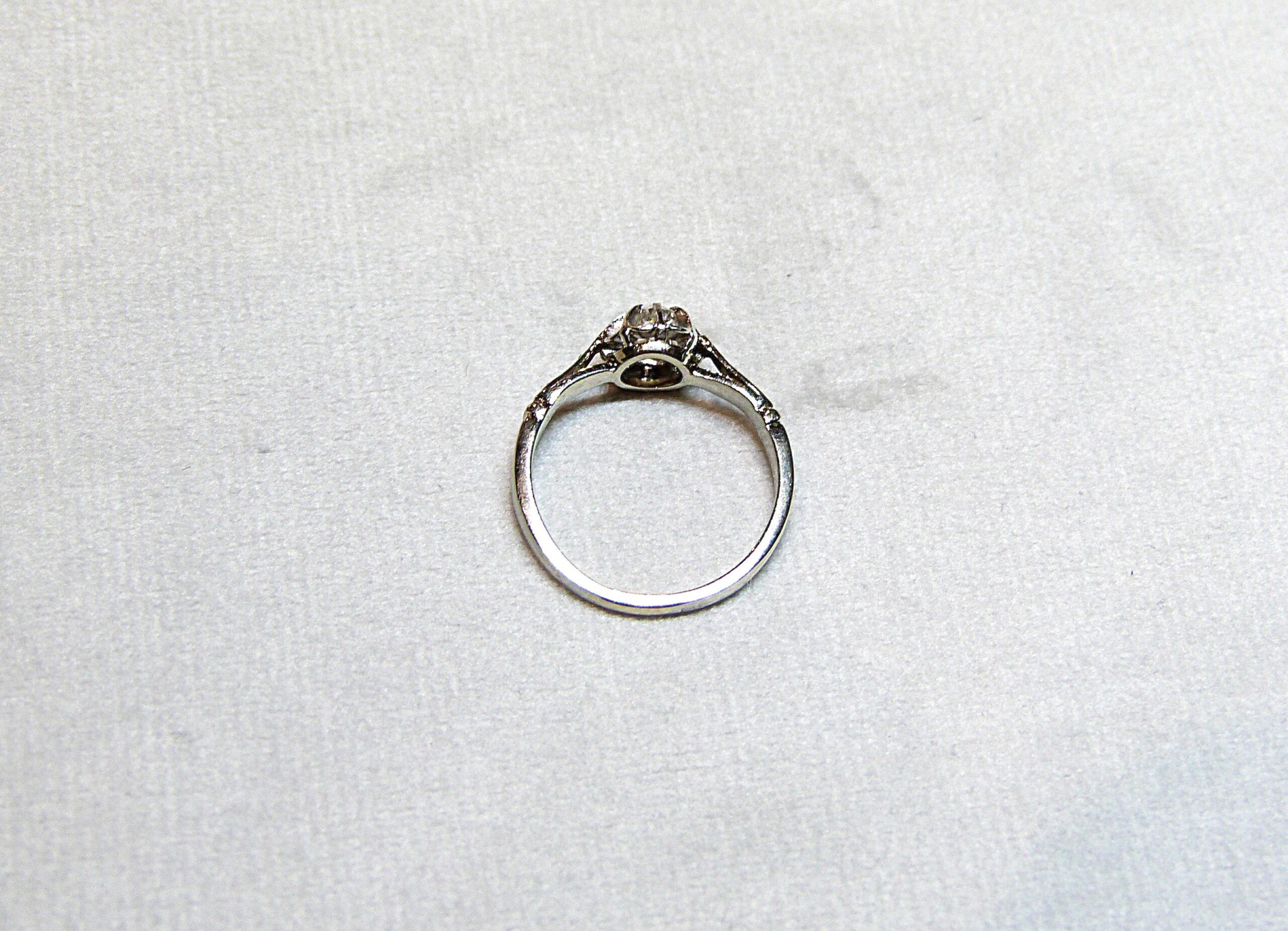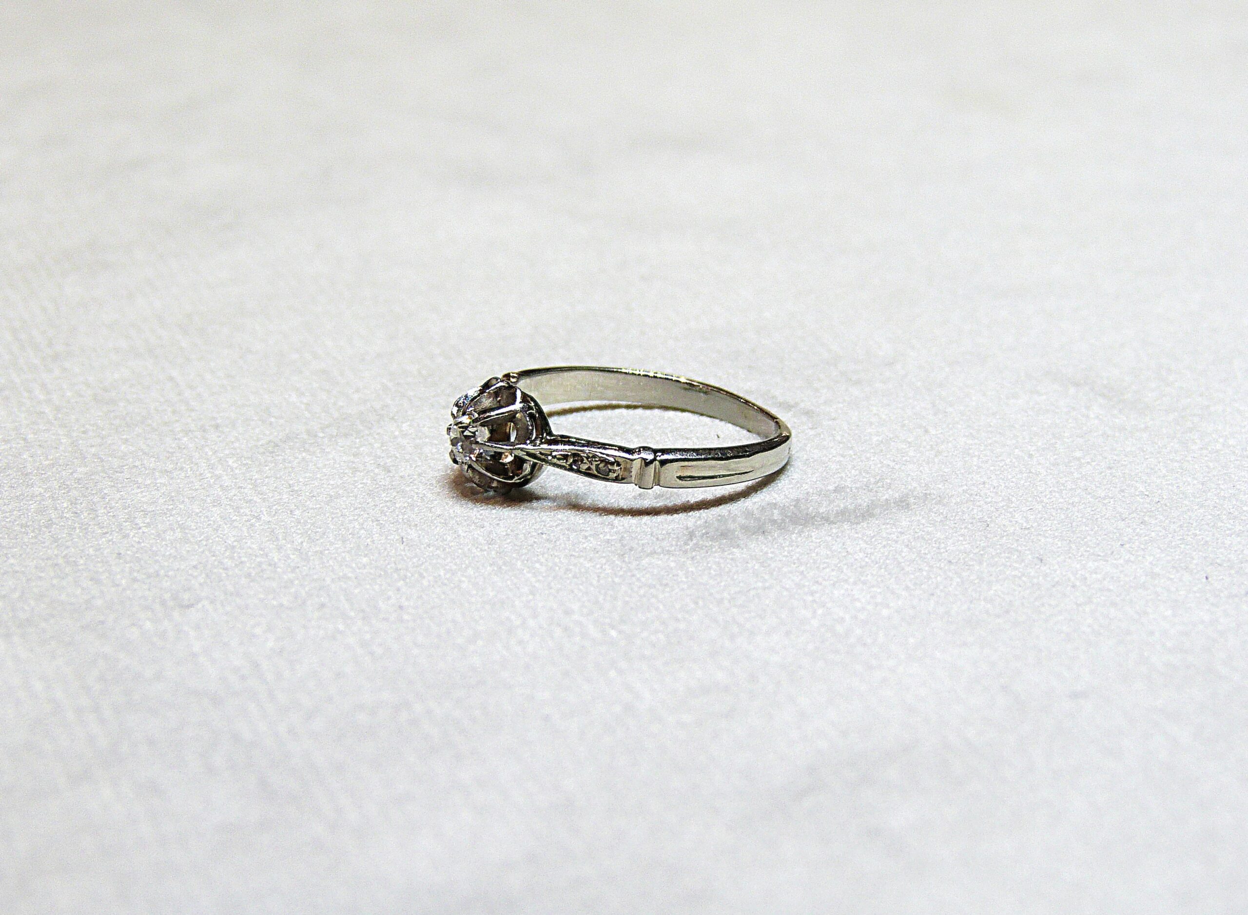 Bague de type solitaire en or gris 750/1000ème ( 18 k ) et platine sertie d’un diamant taille ancienne pesant 0,10 carat environ.