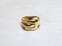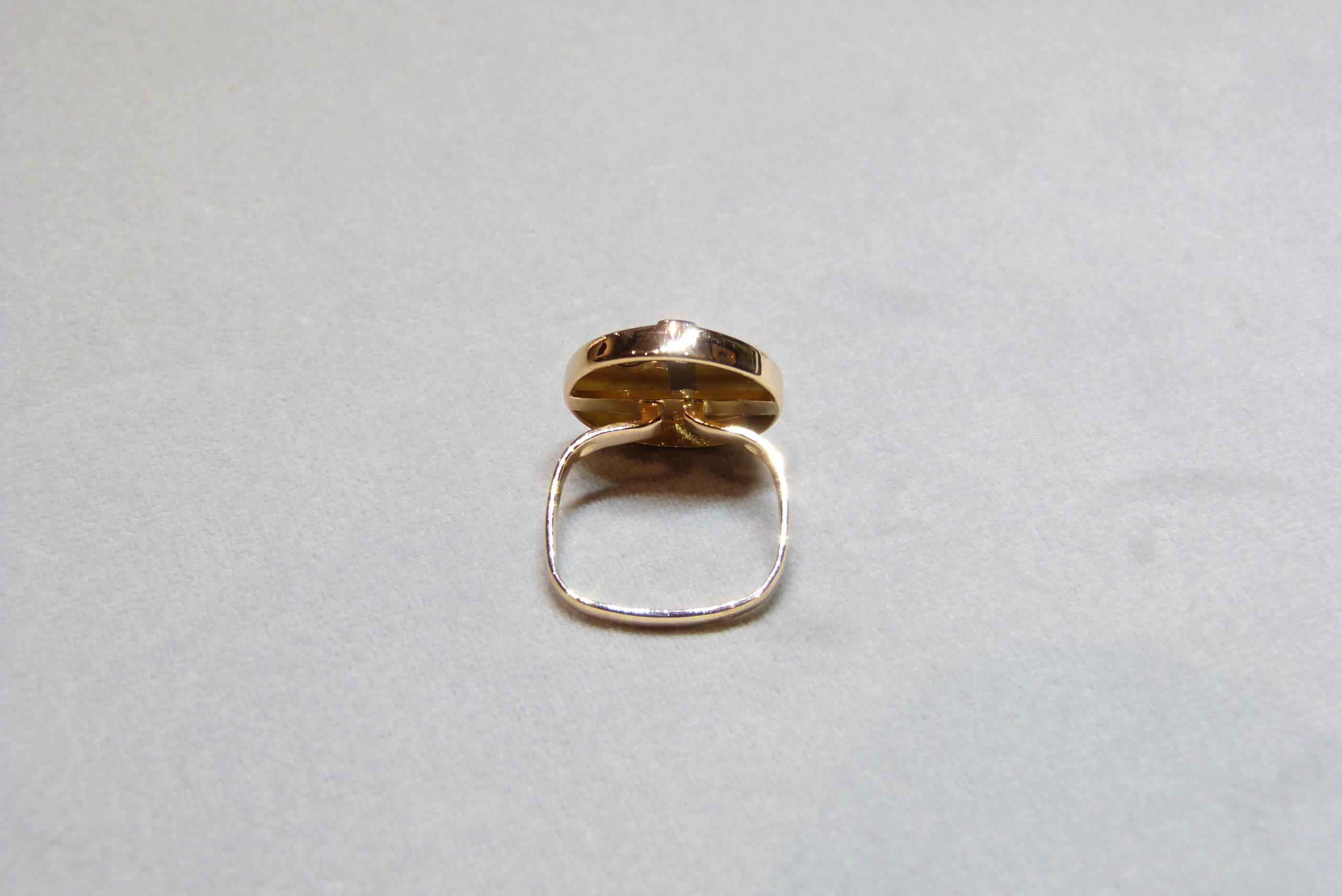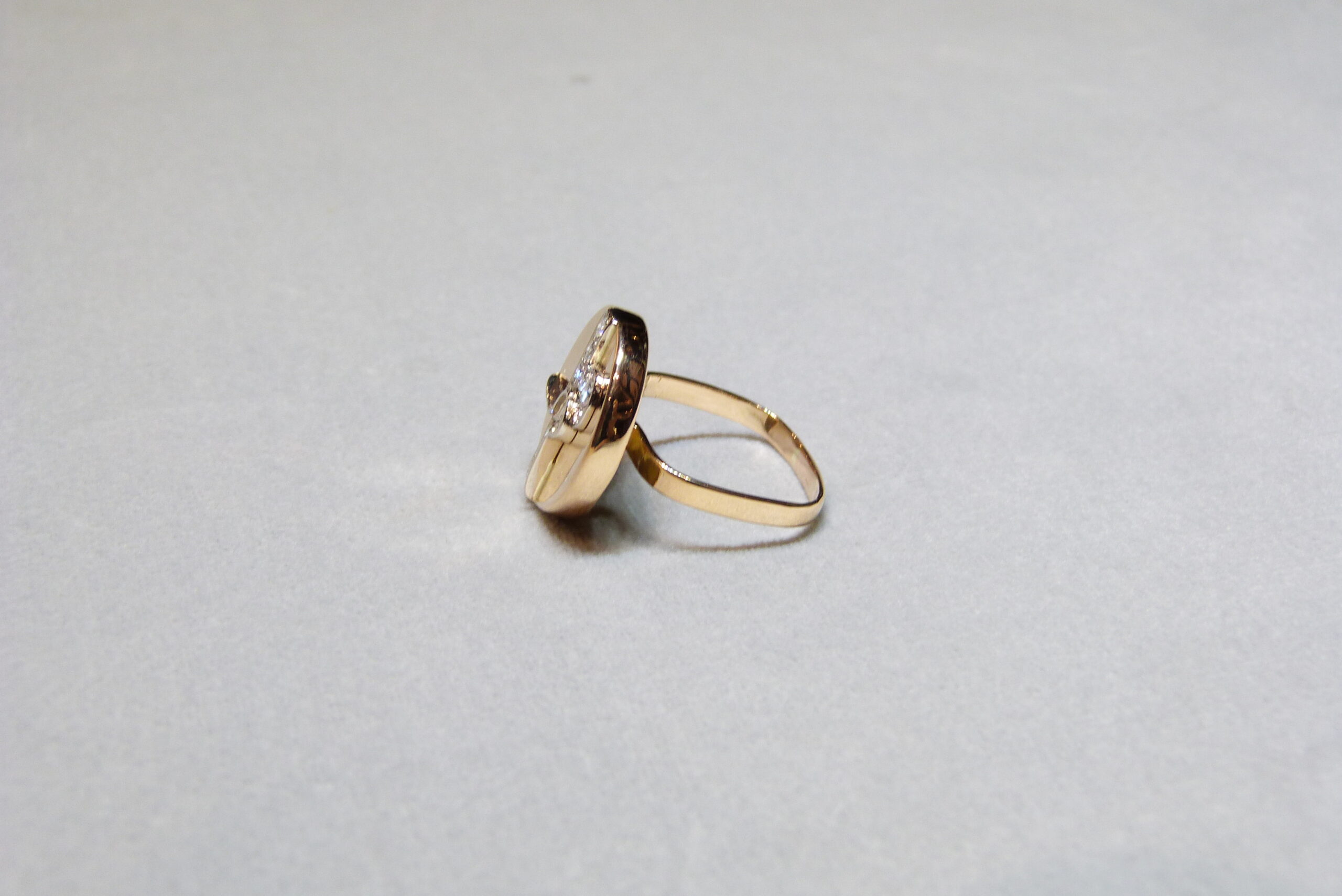 Bague en forme de disque en or jaune 750/1000ème ( 18 k ) sertie de deux lignes géométriques de diamants taille brillant pesant ensemble 0,20 carat environ.