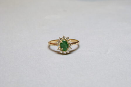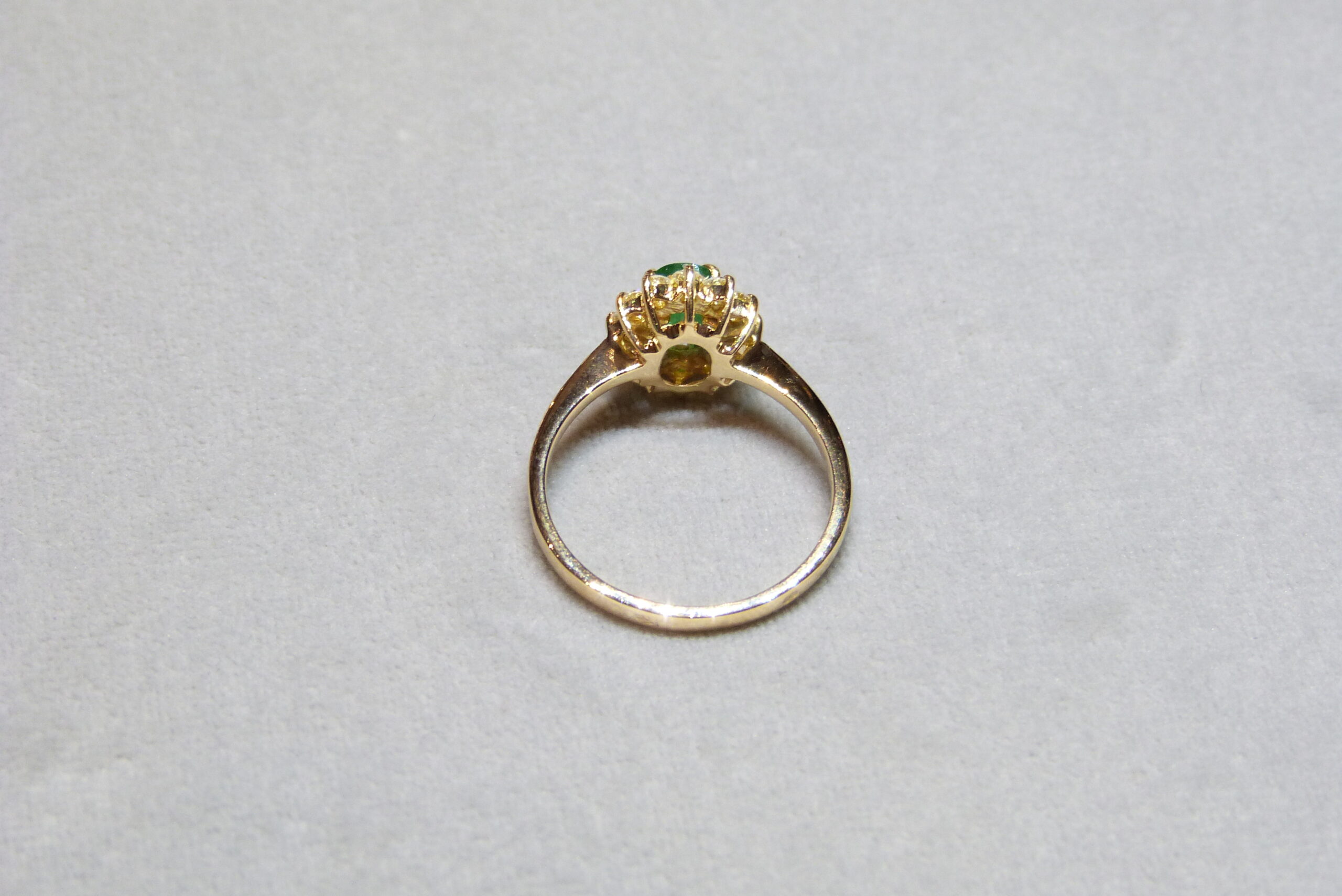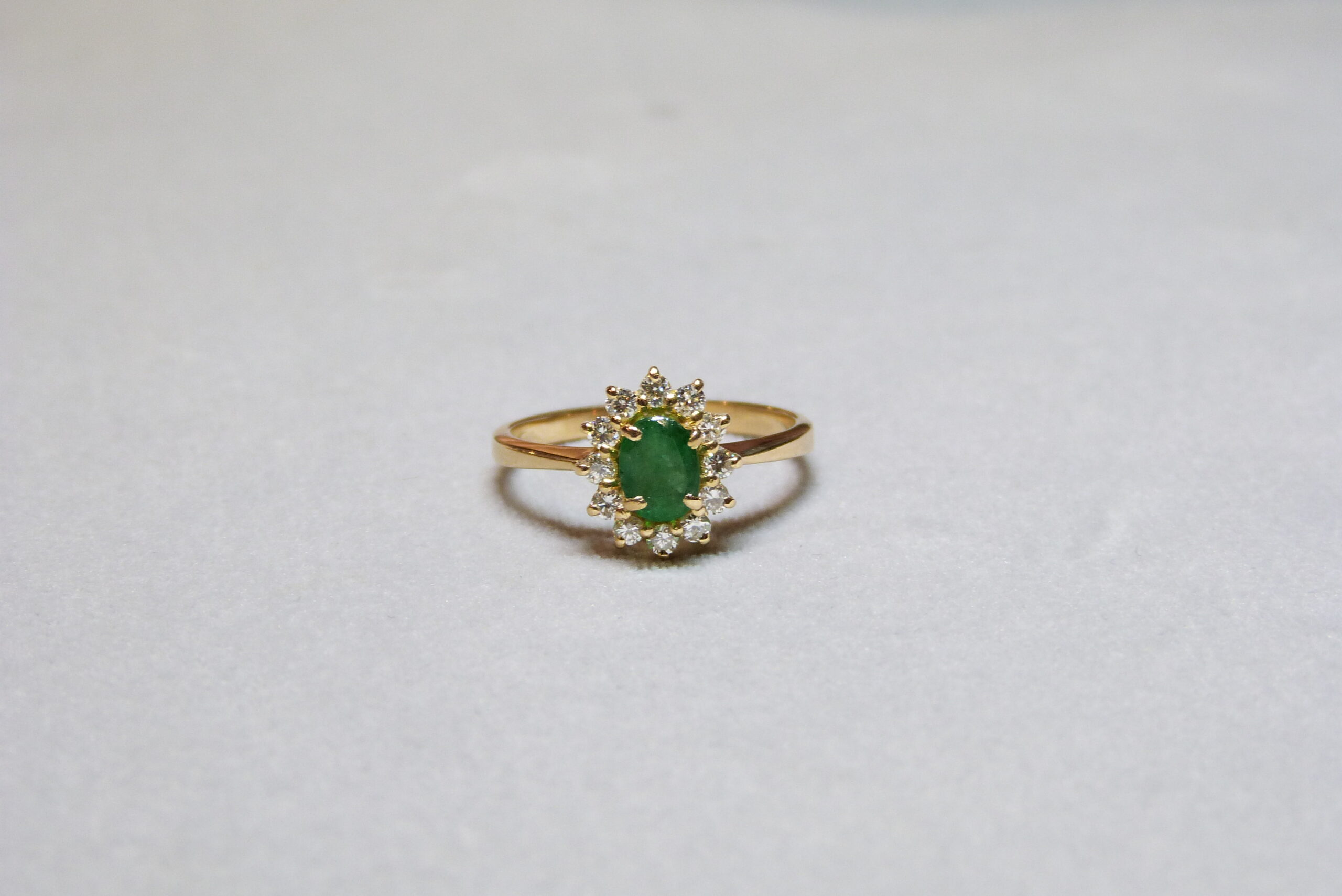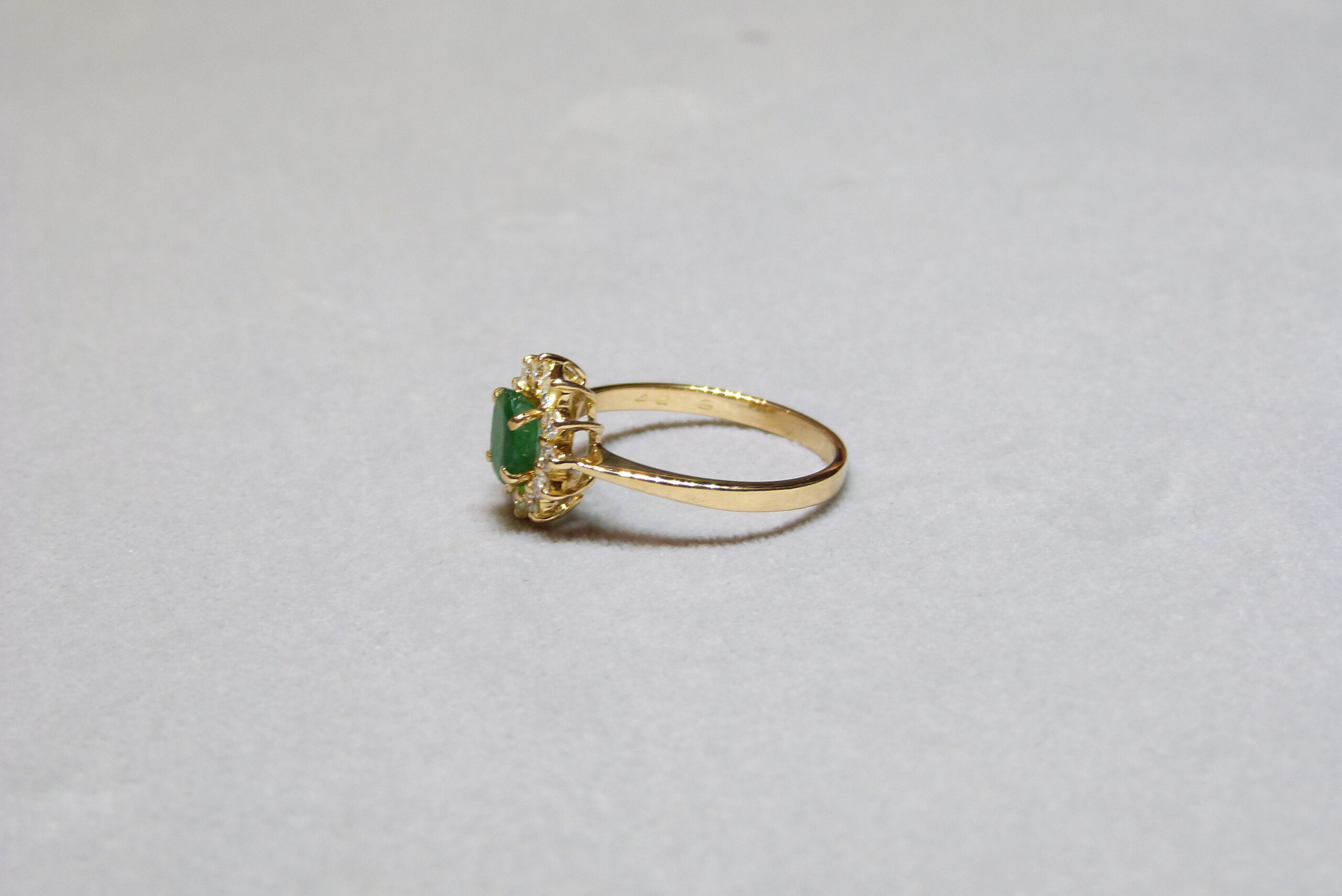 Bague de type « Pompadour » en or jaune 750/1000ème ( 18 k ) sertie en son centre d’une émeraude ovale facettée pesant 0,65 carat environ entourée de 12 diamants taille brillant pesant ensemble 0,24 carat environ.
