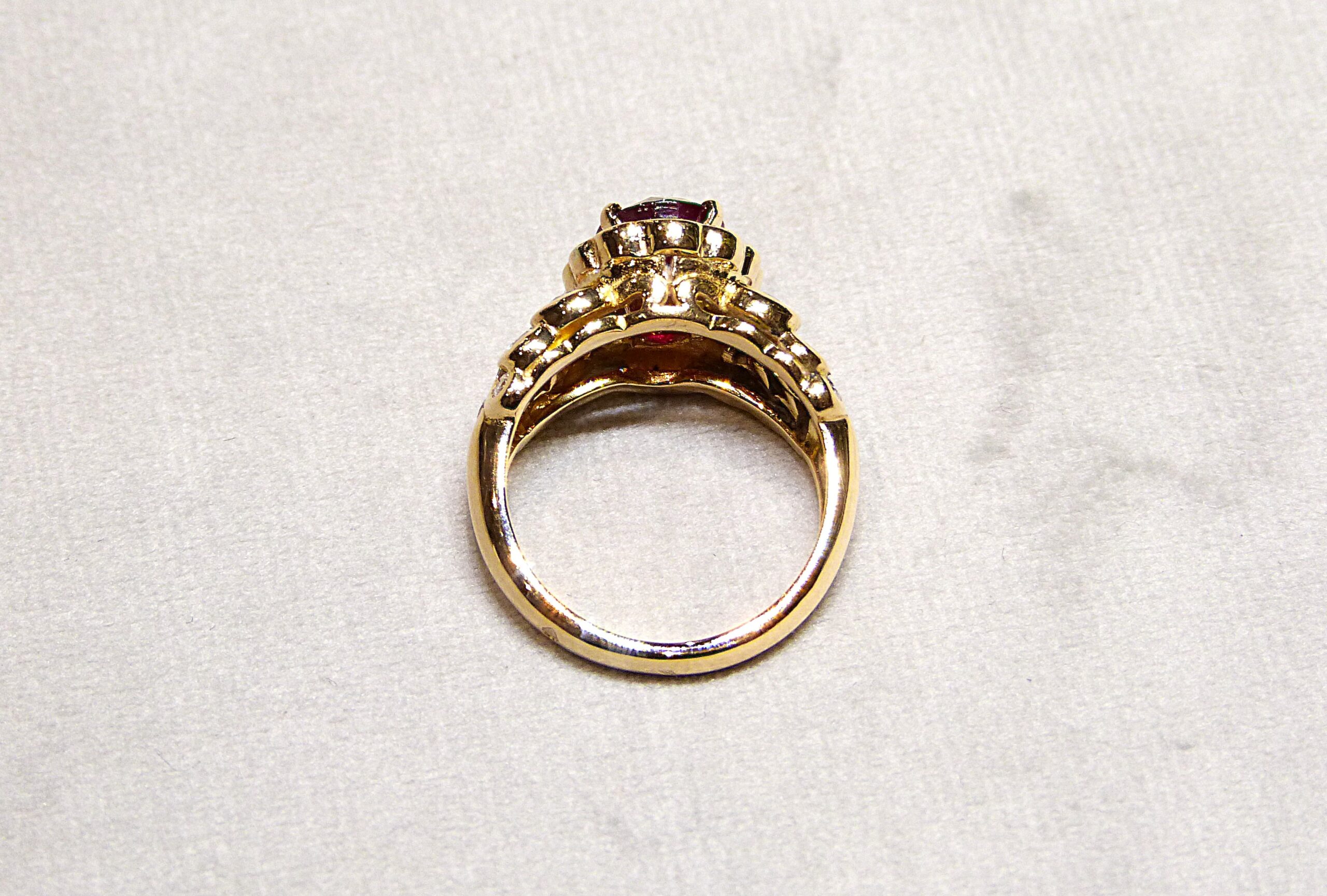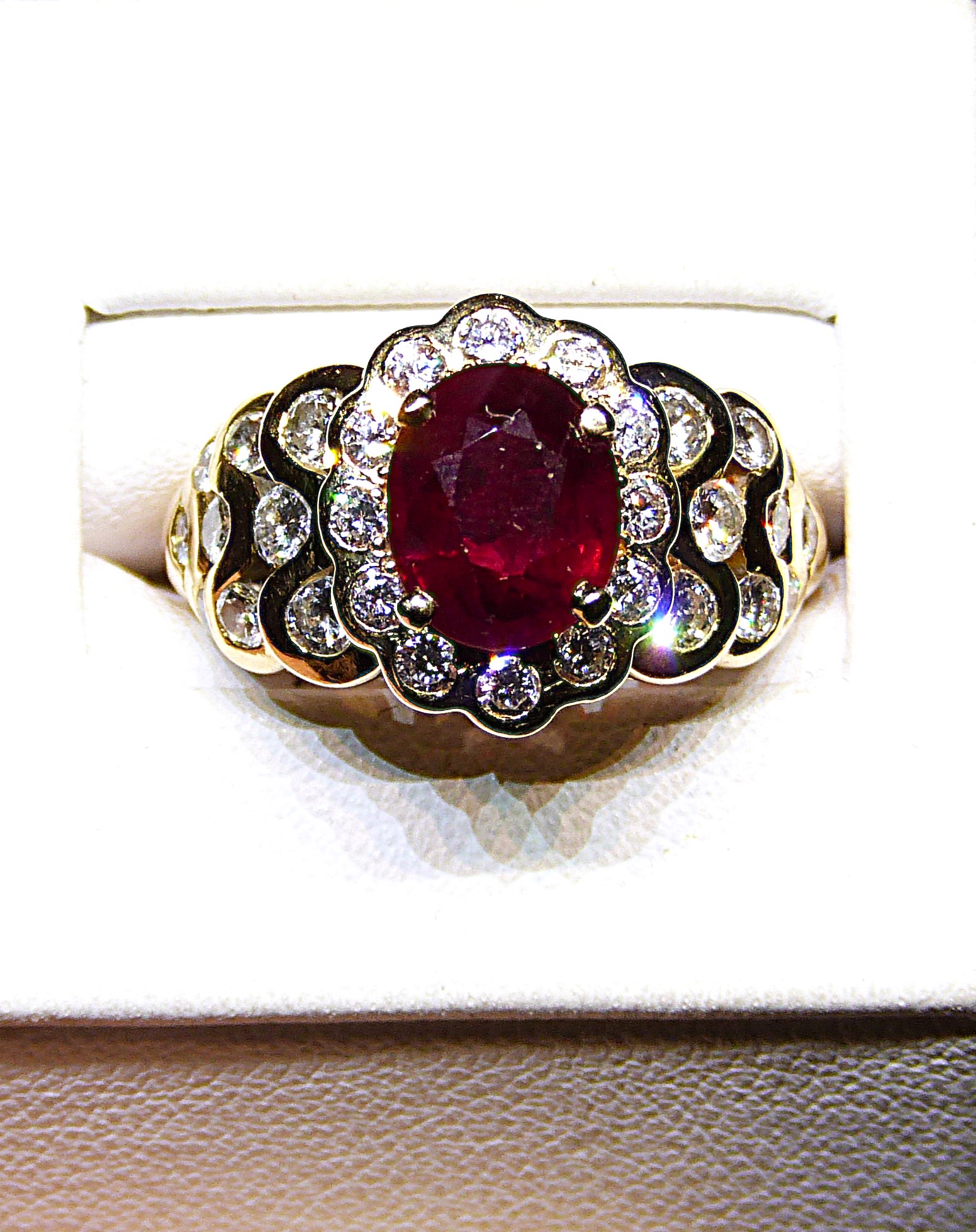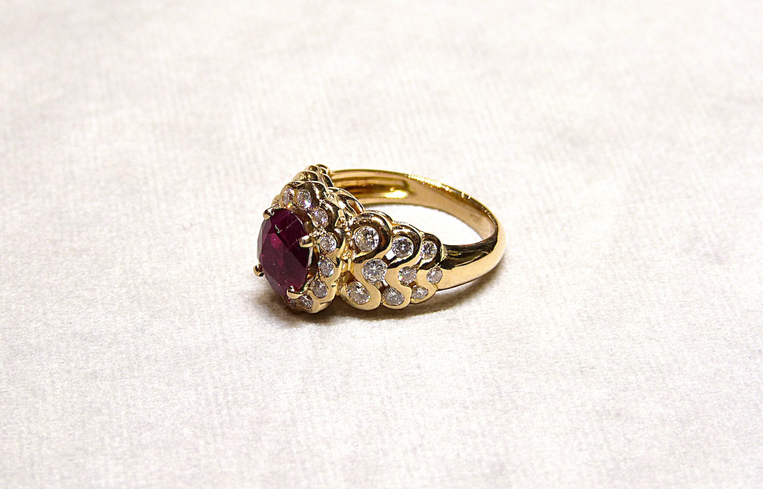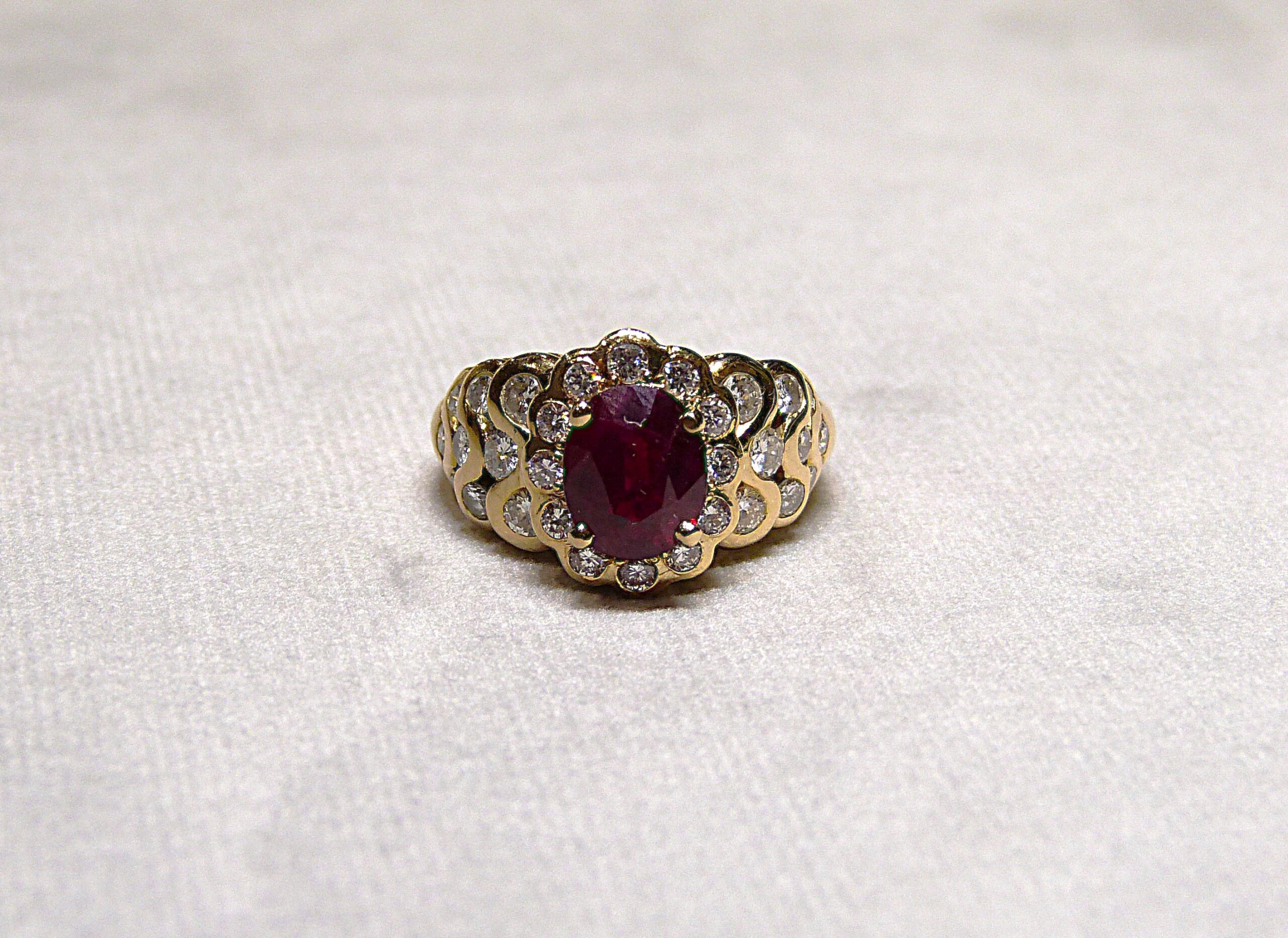 Bague de style Pompadour en or jaune 750/1000ème ( 18 k ) sertie en son centre d’un rubis ovale facetté pesant 2,63 carats ( origine Birmanie, certificat GEM PARIS ), entouré de 12 diamants taille brillant pesant ensemble 0,24 carat environ, les épaulements partiellement sertis de diamants taille brillant pesant ensemble 0,58 carat environ.