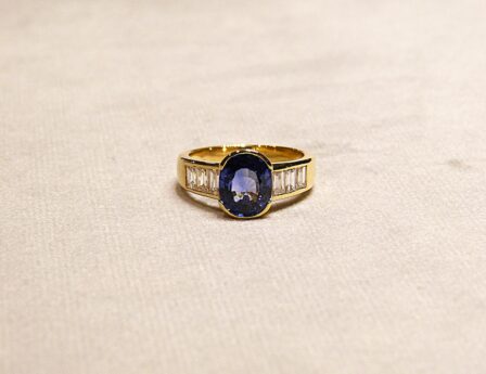 Bague en or jaune 750/1000ème ( 18 k ) sertie en demi-clos d’un saphir ovale facetté d’environ 2,70 carats épaulé de 6 diamants taille baguette pesant ensemble 0,85 carat environ.