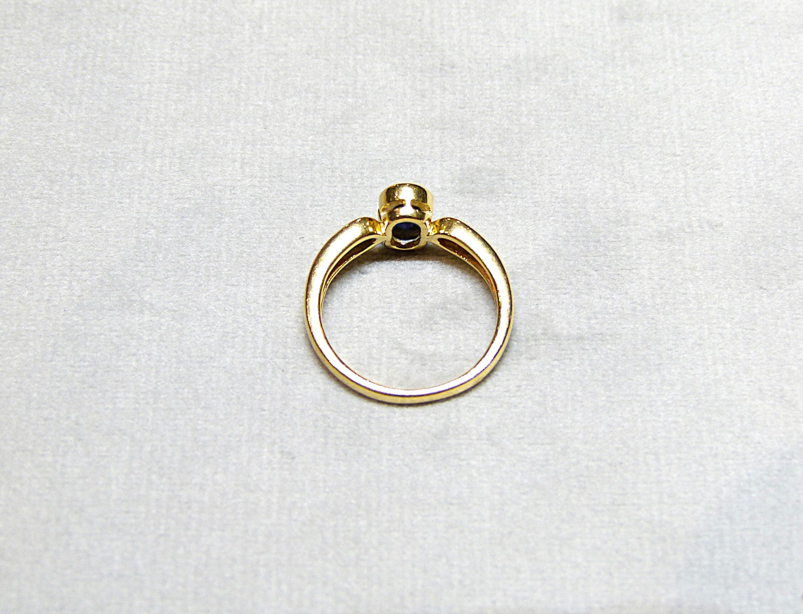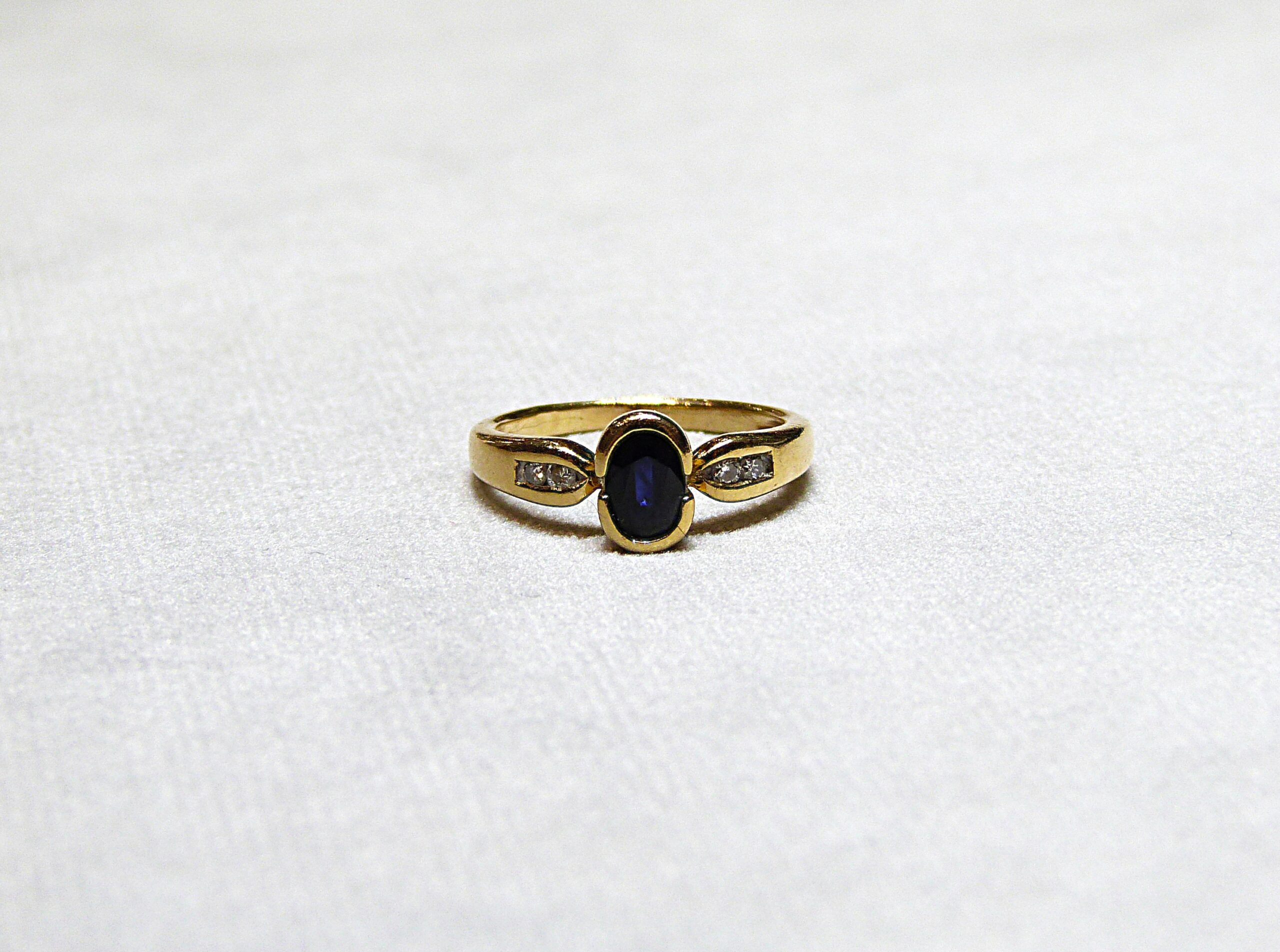 Bague en or jaune 750/1000ème ( 18 k ) sertie d’un saphir ovale facetté d’environ 0,60 carat épaulé de 4 diamants taille brillant pesant ensemble 0,08 carat environ.