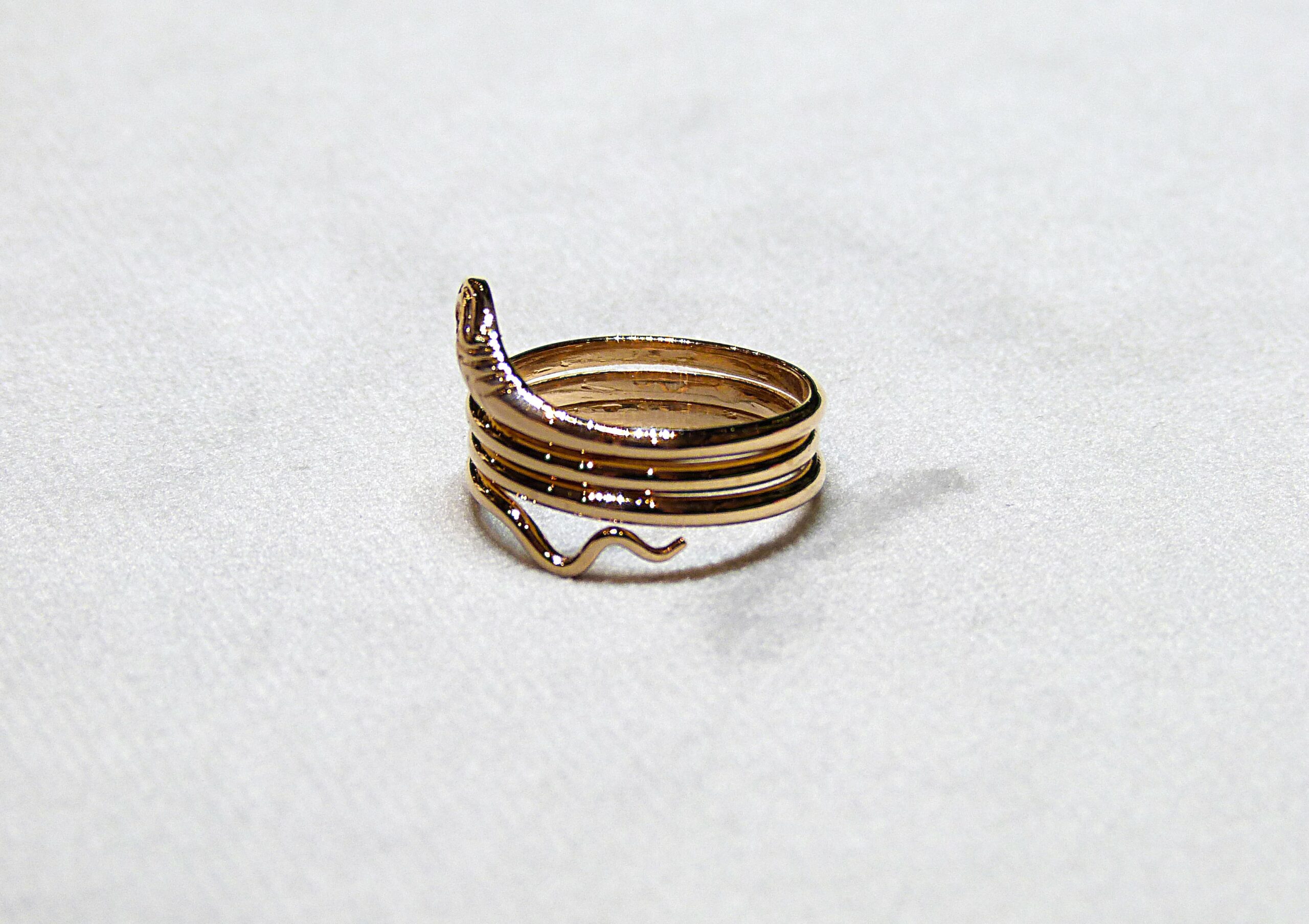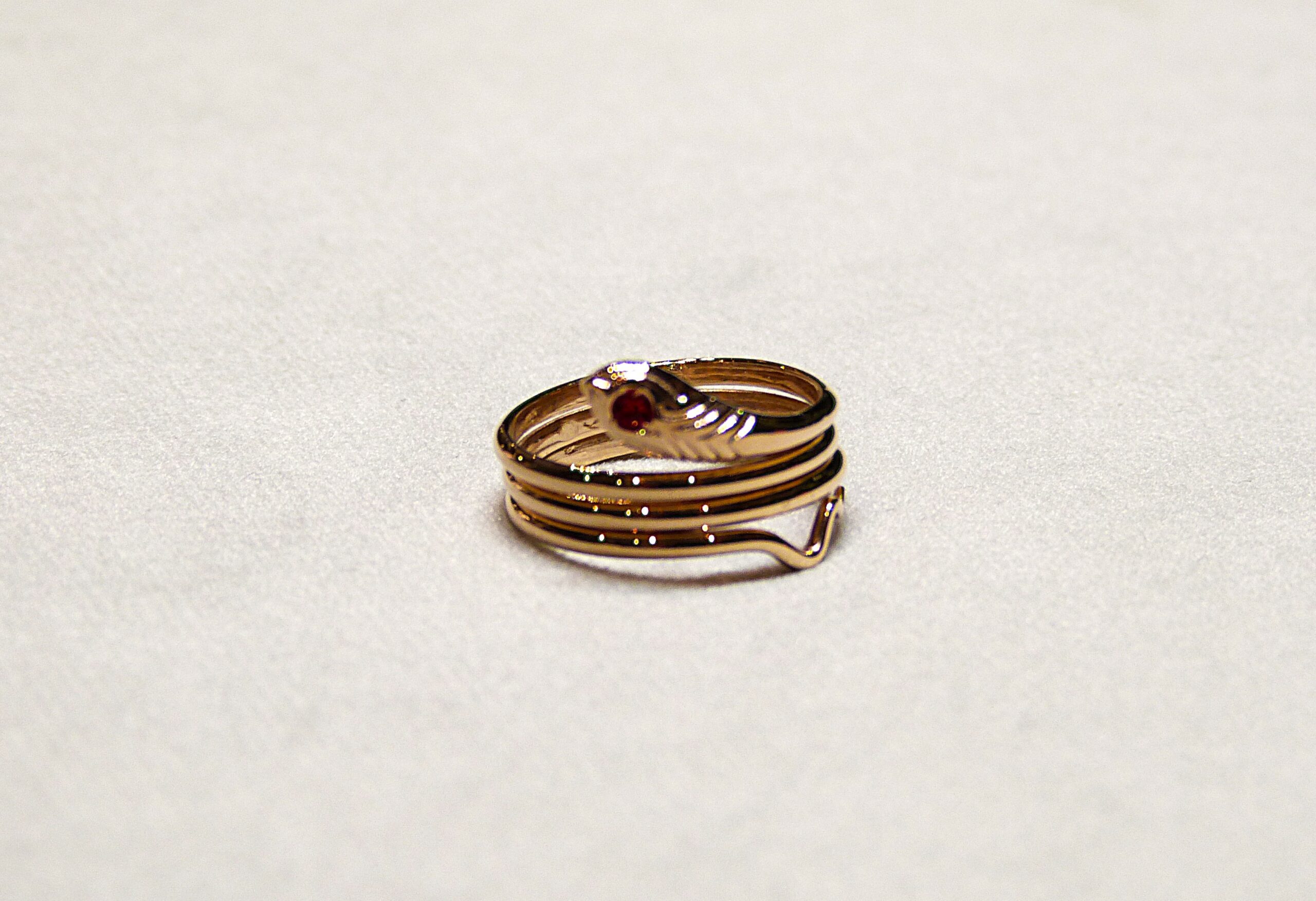 Bague Serpent en or jaune 750/1000ème ( 18 k ) composée de trois anneaux mobiles, l’oeil serti d’une pierre rouge.