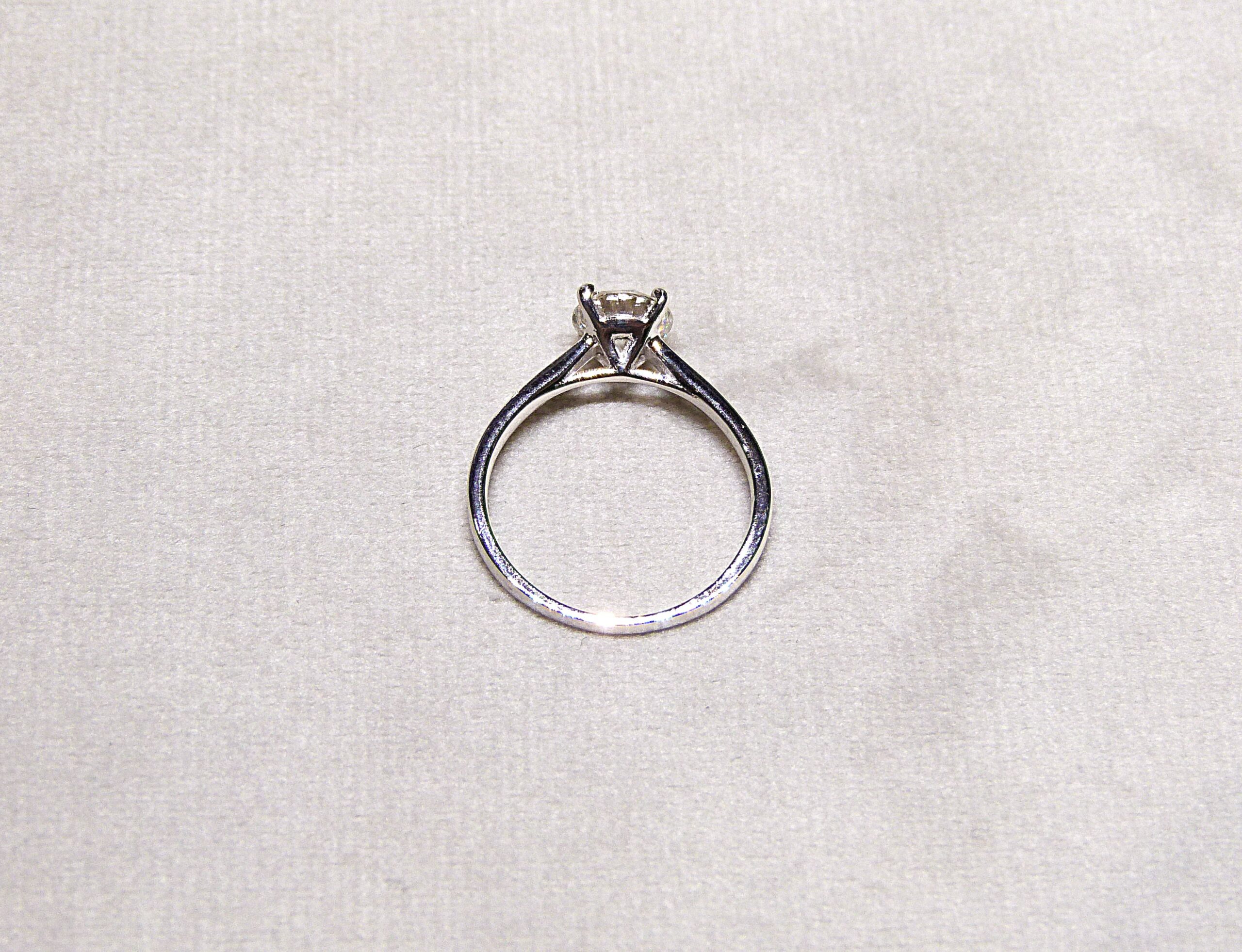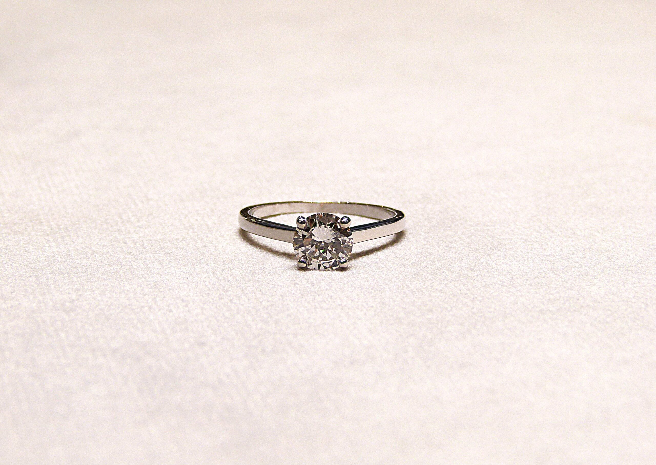 Bague de type solitaire en or gris 750/1000ème ( 18 k ) sertie d’un diamant taille brillant pesant 1,01 carat, couleur G, pureté VVS2 ( certificat LFG ).