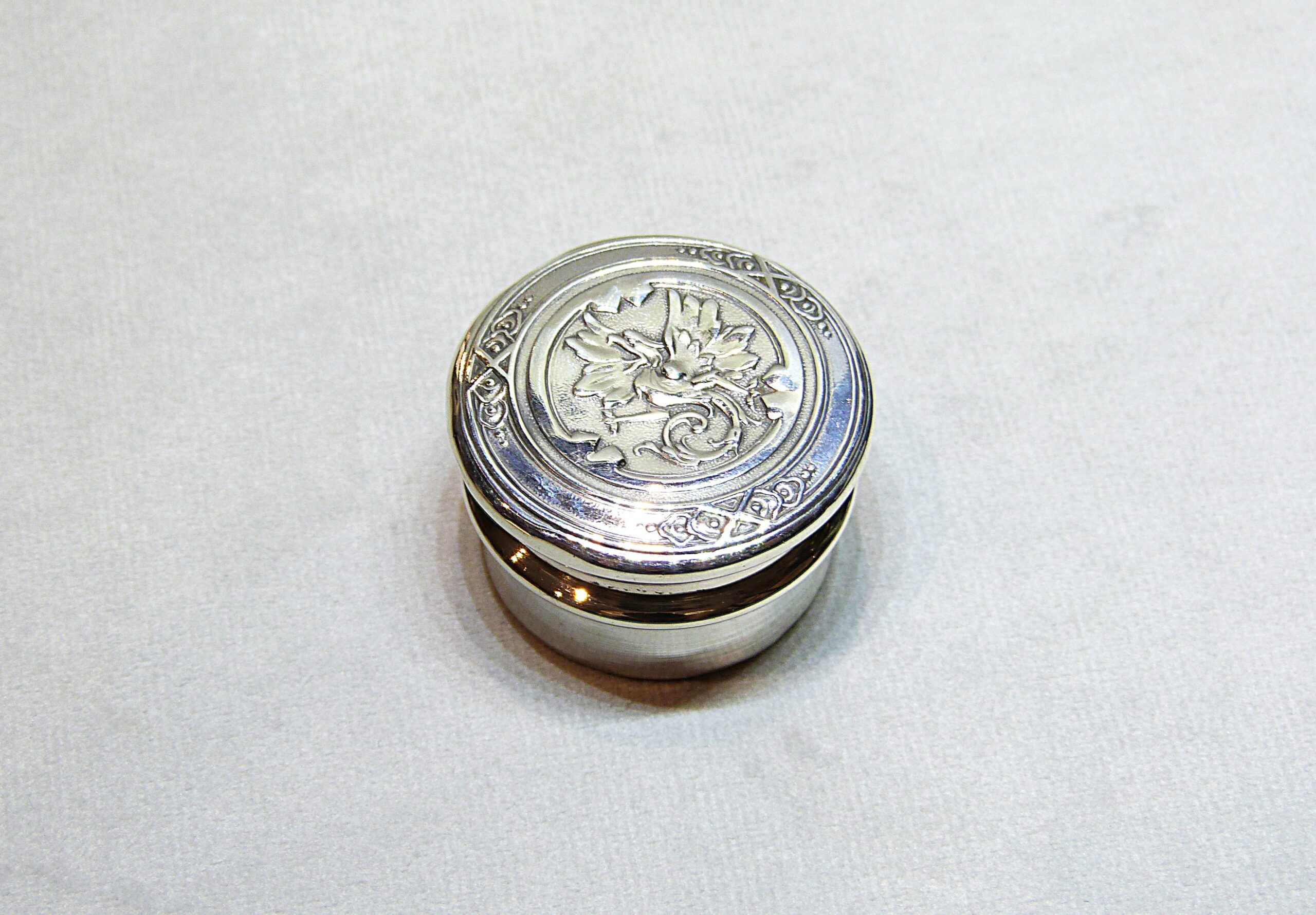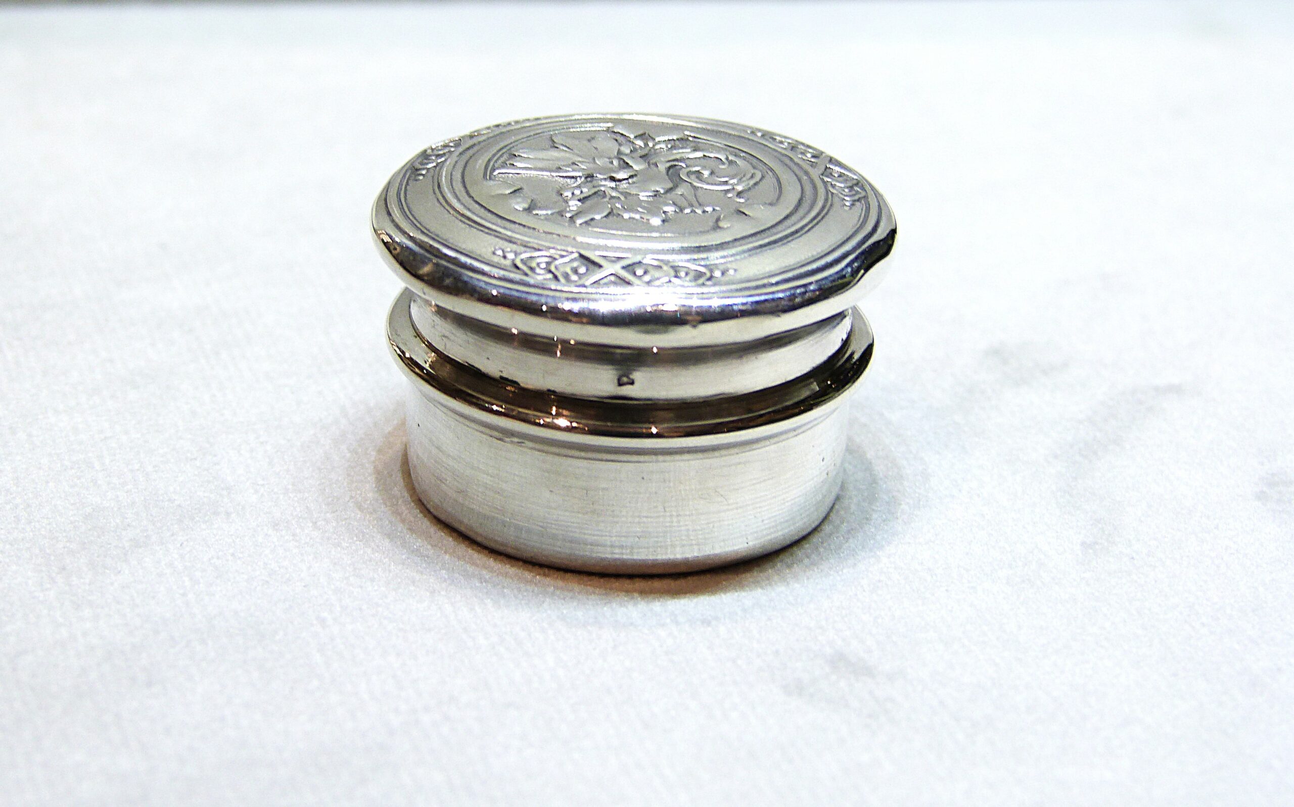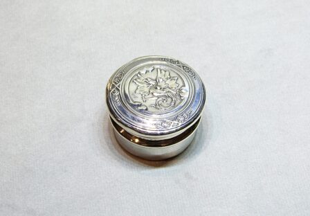 Cliquez pour agrandir Tweet 125 € quantité de Boîte à pilules argent Ajouter au panier Catégorie : Boites et objets de vitrine Étiquettes : argent, argent 800, boîte à pilules, boîte argent Description Informations complémentaires Description Boîte à pilules ronde en argent 800/1000eme à décor ciselé en relief de chimère. Informations complémentaires Poids 13 g Dimensions 3 × 3 × 2 cm Suggestions VENDUE Timbale tulipe 2e coq 1809-1819 VENDUE Tabatière argent Ajouter au panierVoir le détail Boucles d’oreilles BERGUE & CO 180 €
