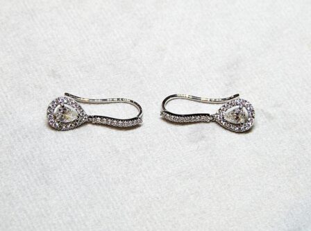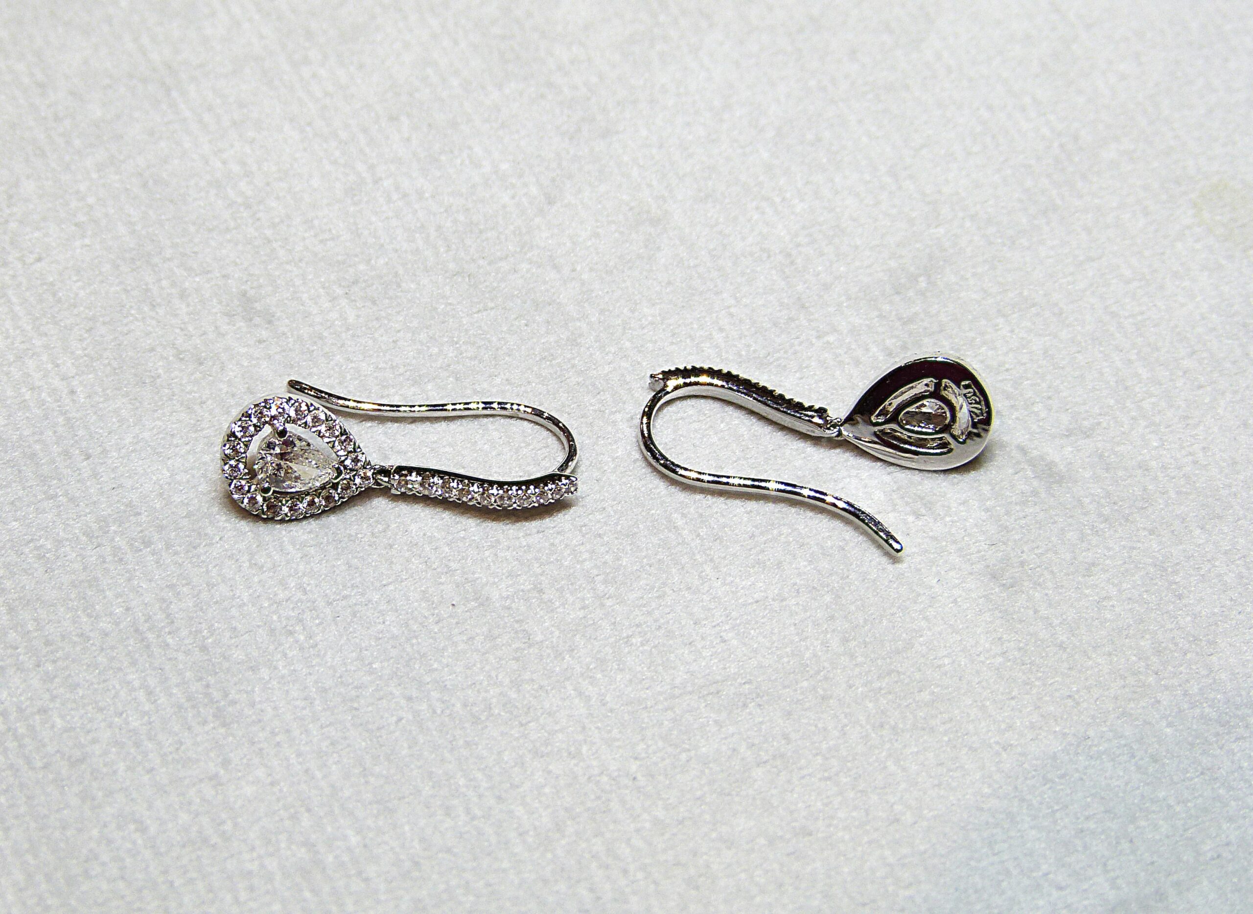 Paire de pendants d’oreilles en or gris 750/1000ème ( 18 k ) sertis de diamants taille poire pesant chacun 0,12 carat environ entourés de petits diamants taille brillant pesant ensemble 0,40 carat environ.