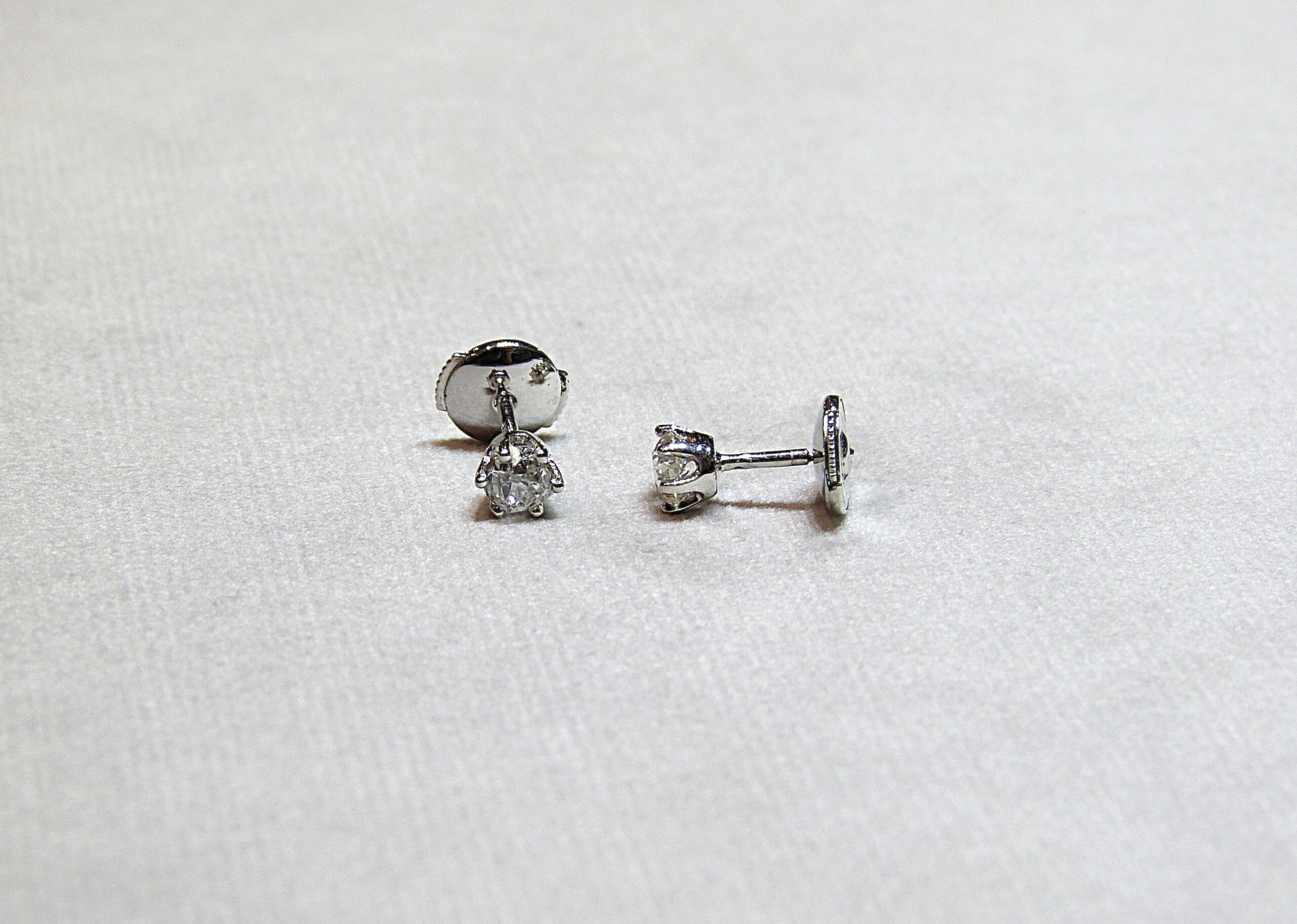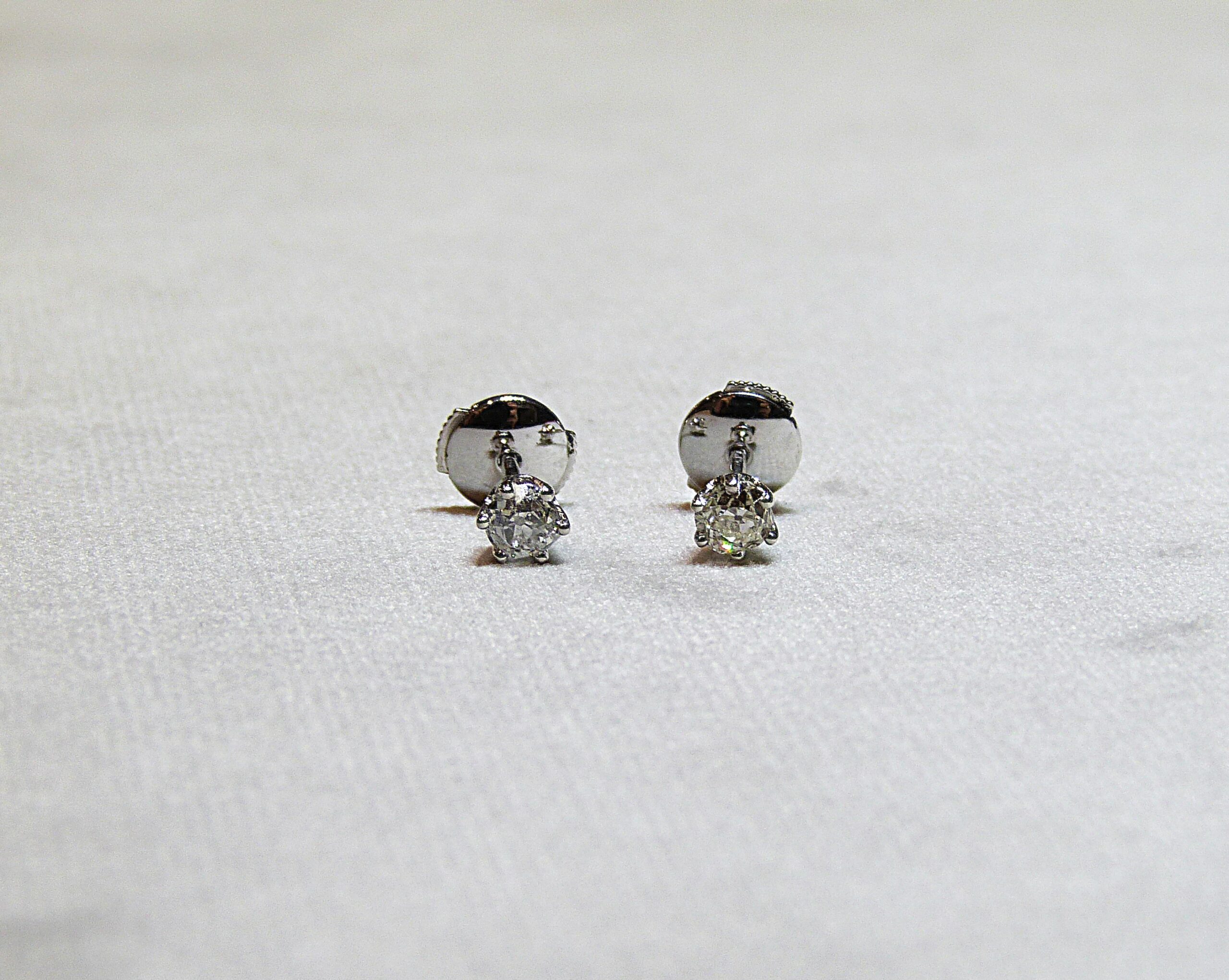 Paire de clous d’oreilles en or gris 750/1000ème ( 18 k ) sertis de diamants taille ancienne pesant chacun 0,25 carat environ, systèmes alpas.