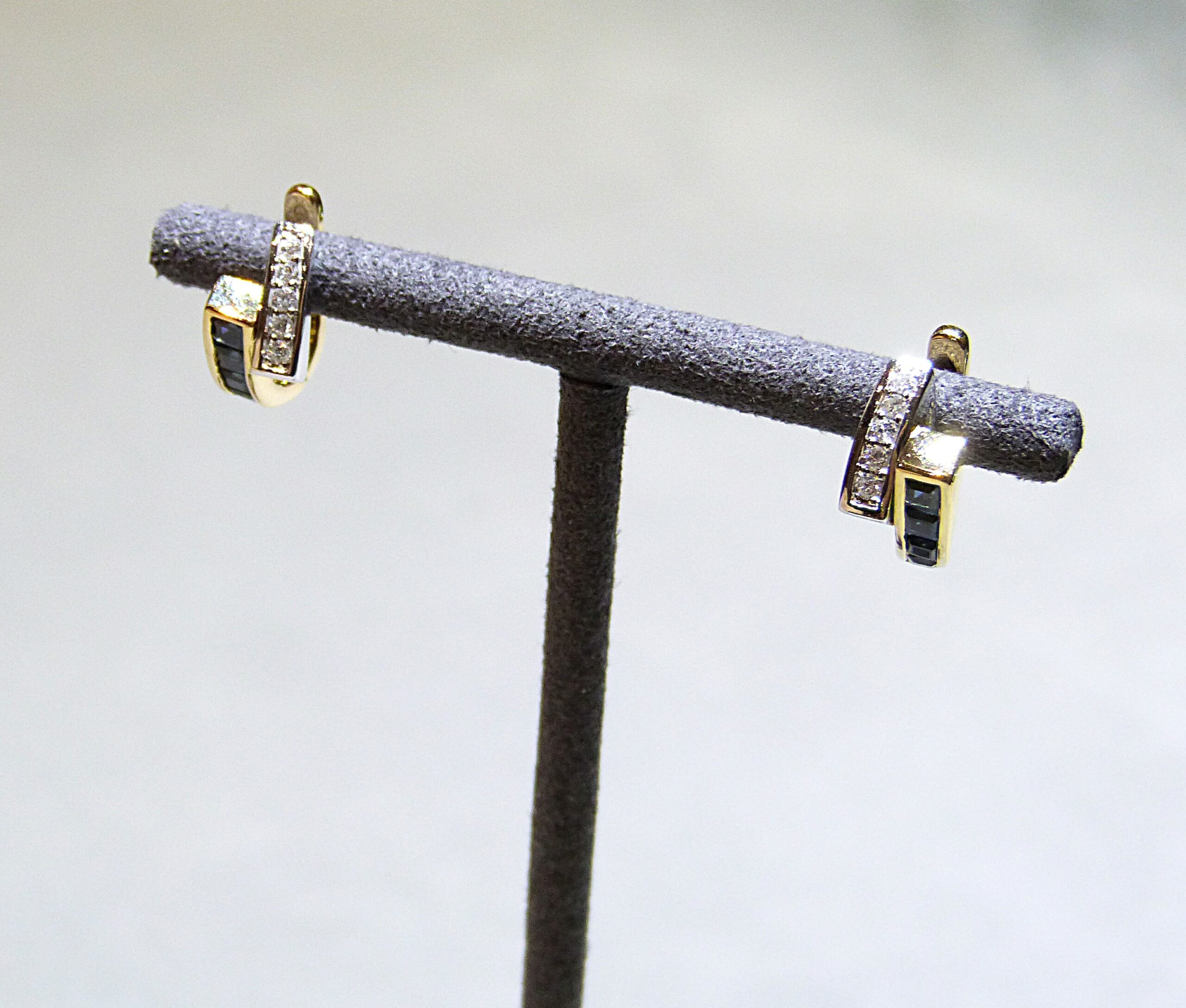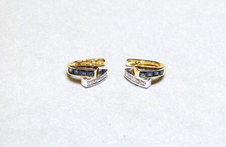 Paire de boucles d’oreilles en or jaune 750/1000ème ( 18 k ) serties de saphirs calibrés et de petits diamants taille brillant pesant ensemble 0,20 carat environ.