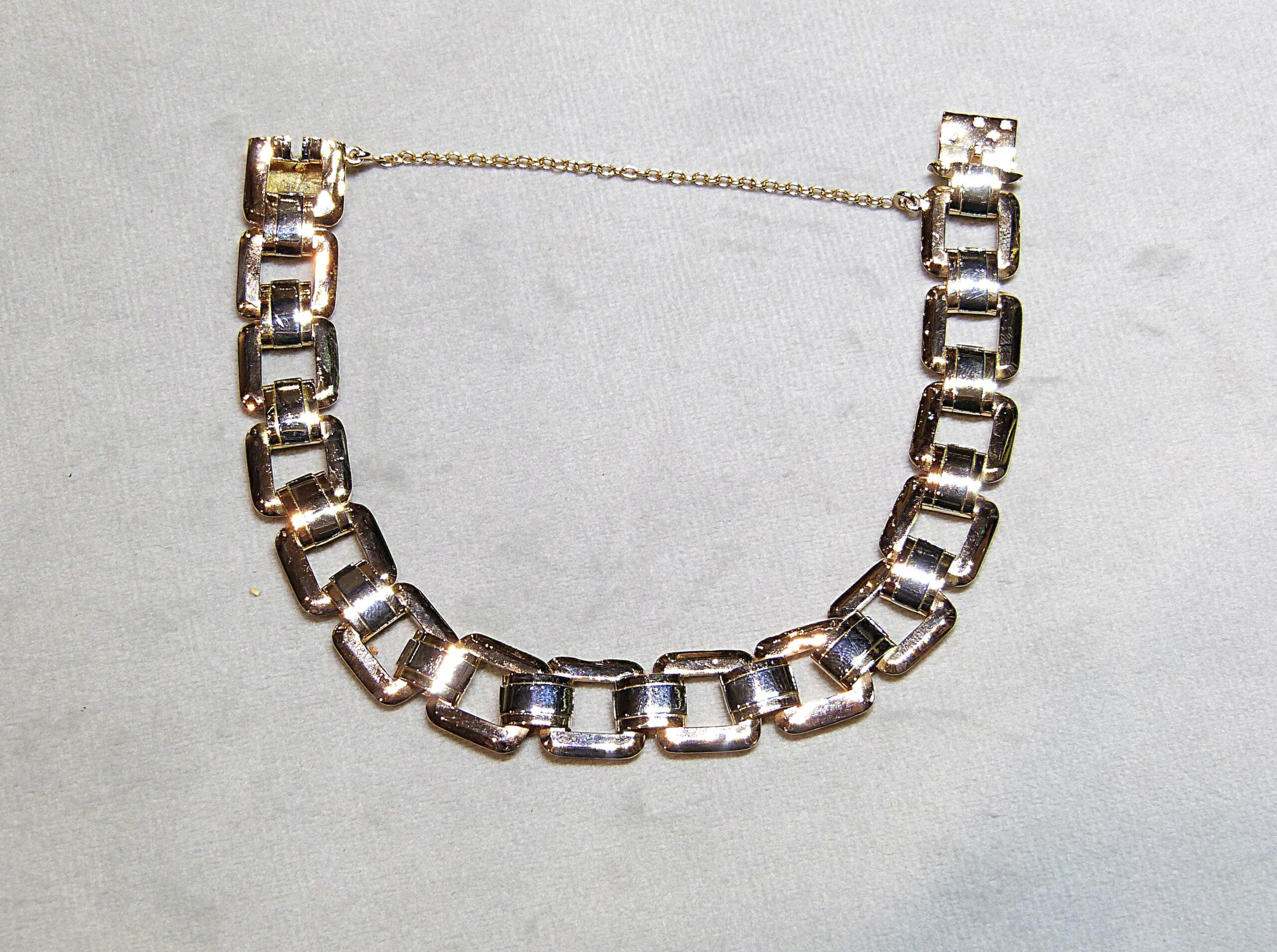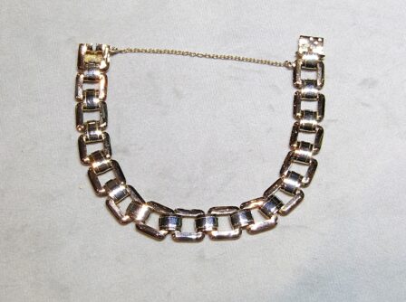 Bracelet en or 750/1000ème ( 18 k ) bicolore à maillons carrés, chaînette de sécurité.
