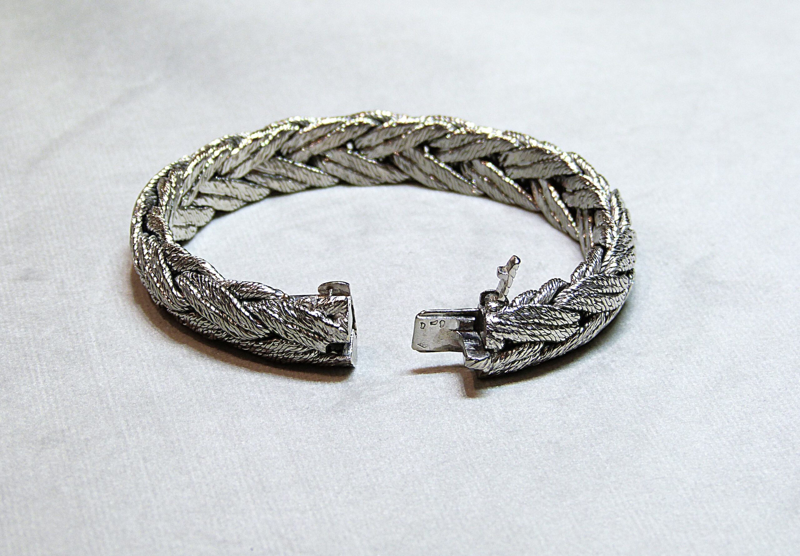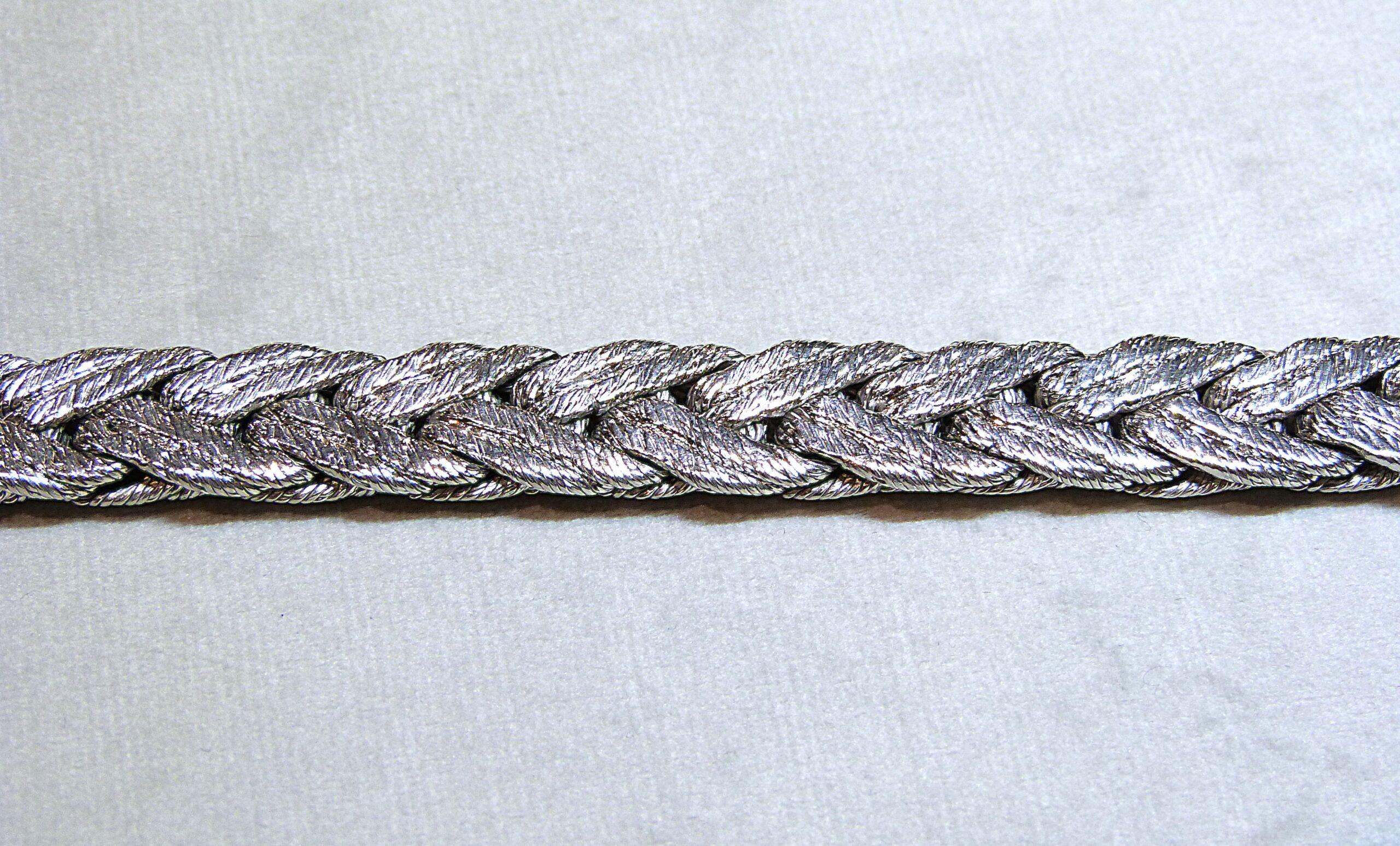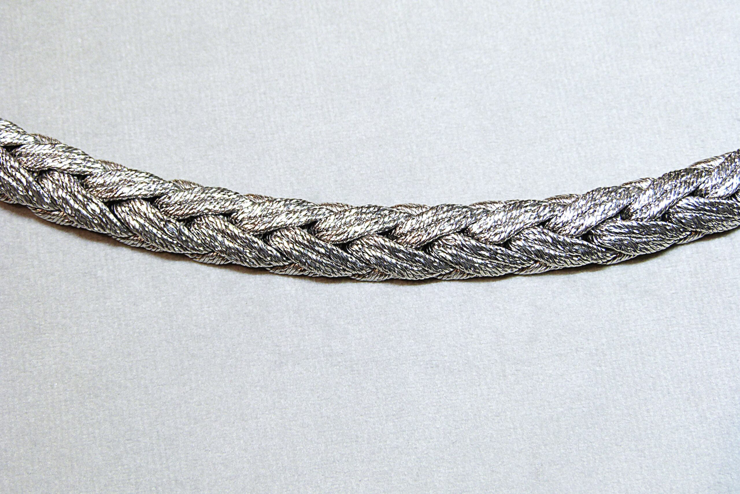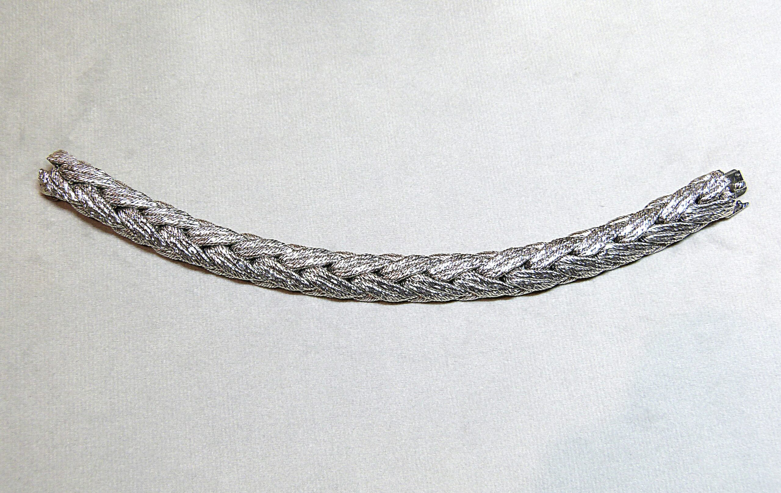 Cliquez pour agrandir Tweet Catégorie : Bracelets Étiquettes : 1970, bracelet, bracelet vintage, or 18 k, or 750, or gris Description Informations complémentaires Description Bracelet en or gris 750/1000ème ( 18 k ) tressé. Vers 1970. Prix sur demande. Informations complémentaires Poids 94.1 g Dimensions 18.3 cm Suggestions Ajouter au panierVoir le détail Bracelet perles de culture 980 € Ajouter au panierVoir le détail Bracelet or gris diamants « Un p’tit trip d’amour » MAUBOUSSIN 1 500 € VENDU Bracelet or jaune