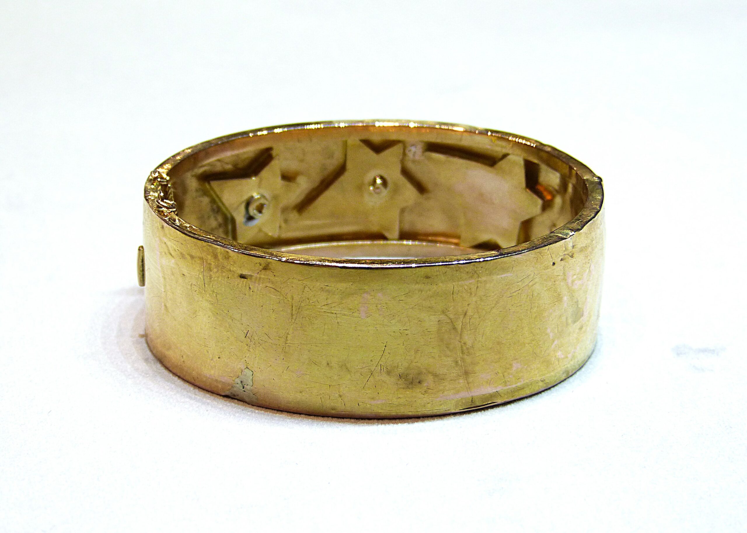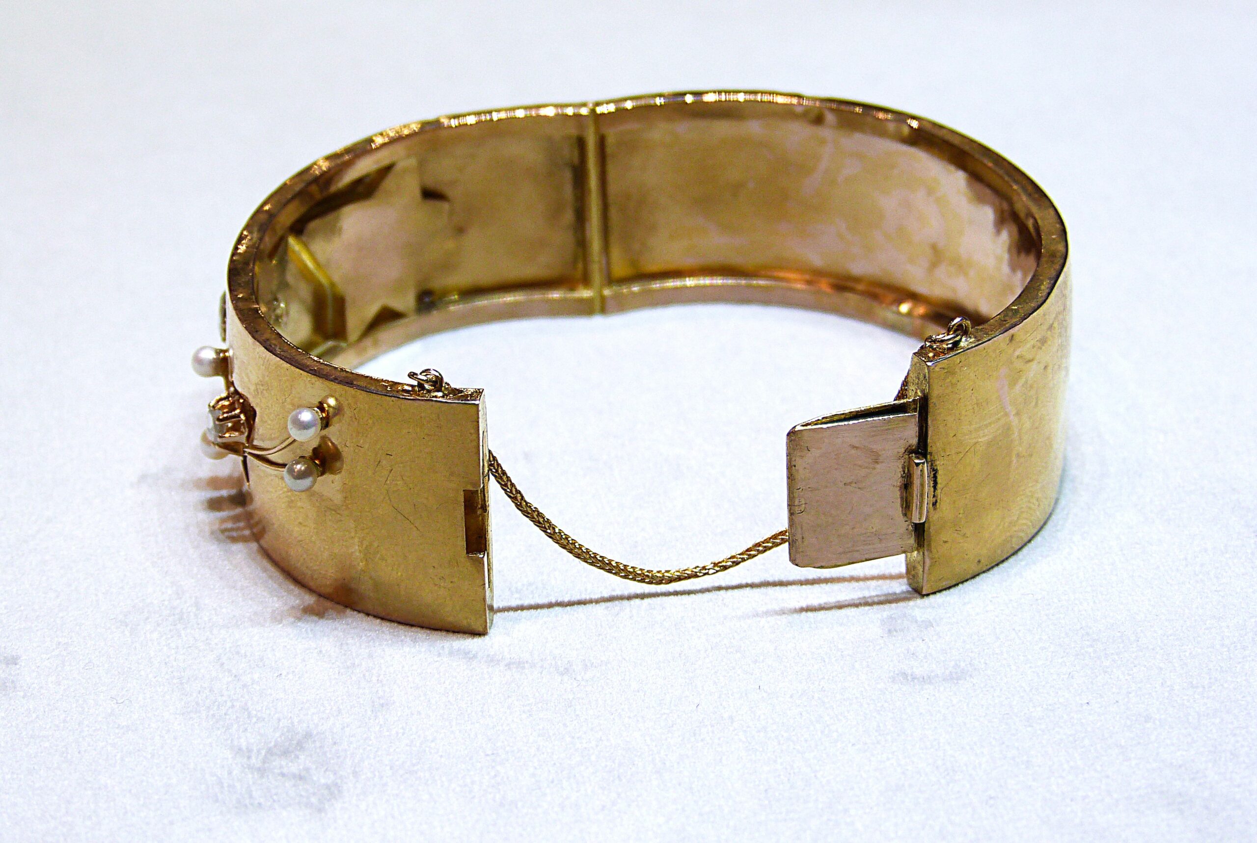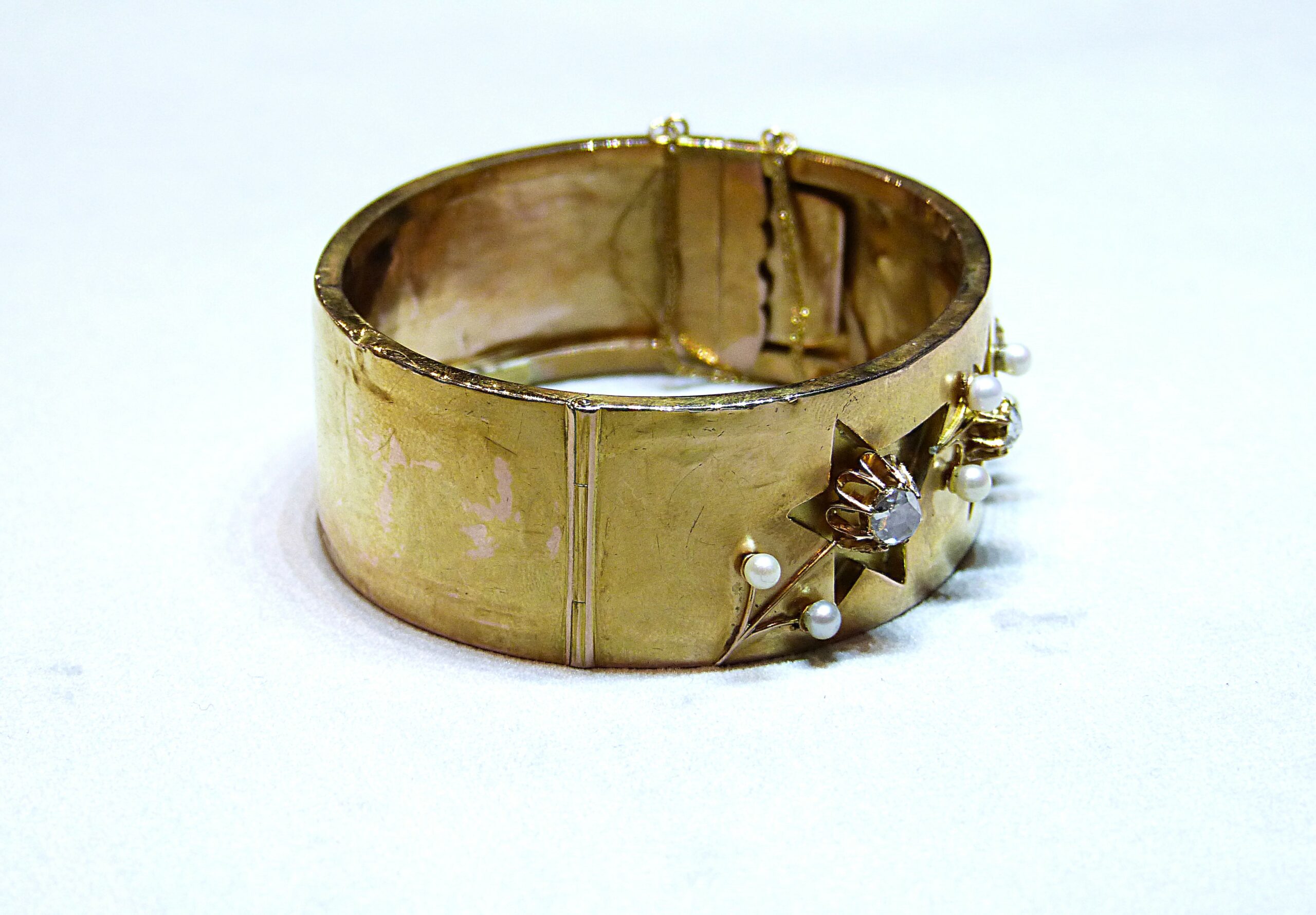Large bracelet rigide ouvrant en or jaune 750/1000ème ( 18 k ) à décor d’étoiles serties de diamants taille rose et de perles fines.
