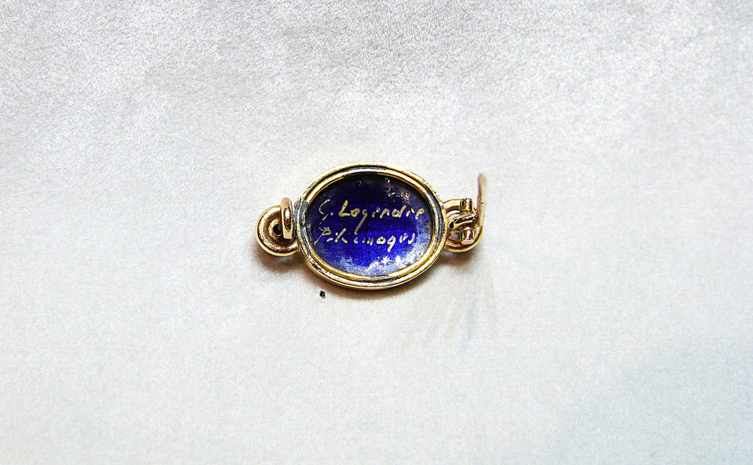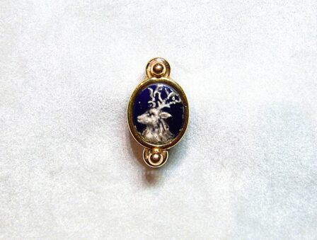Petite broche de forme ovale en or jaune 750/1000ème ( 18 k ) ornée d’un émail de Limoges à fond bleu marine représentant une tête de cerf.