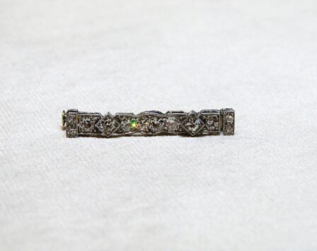 Broche de type barrette en or gris 750/1000ème ( 18 k ) et platine 900/1000ème sertie de diamants taille ancienne pesant ensemble 0,55 carat environ.