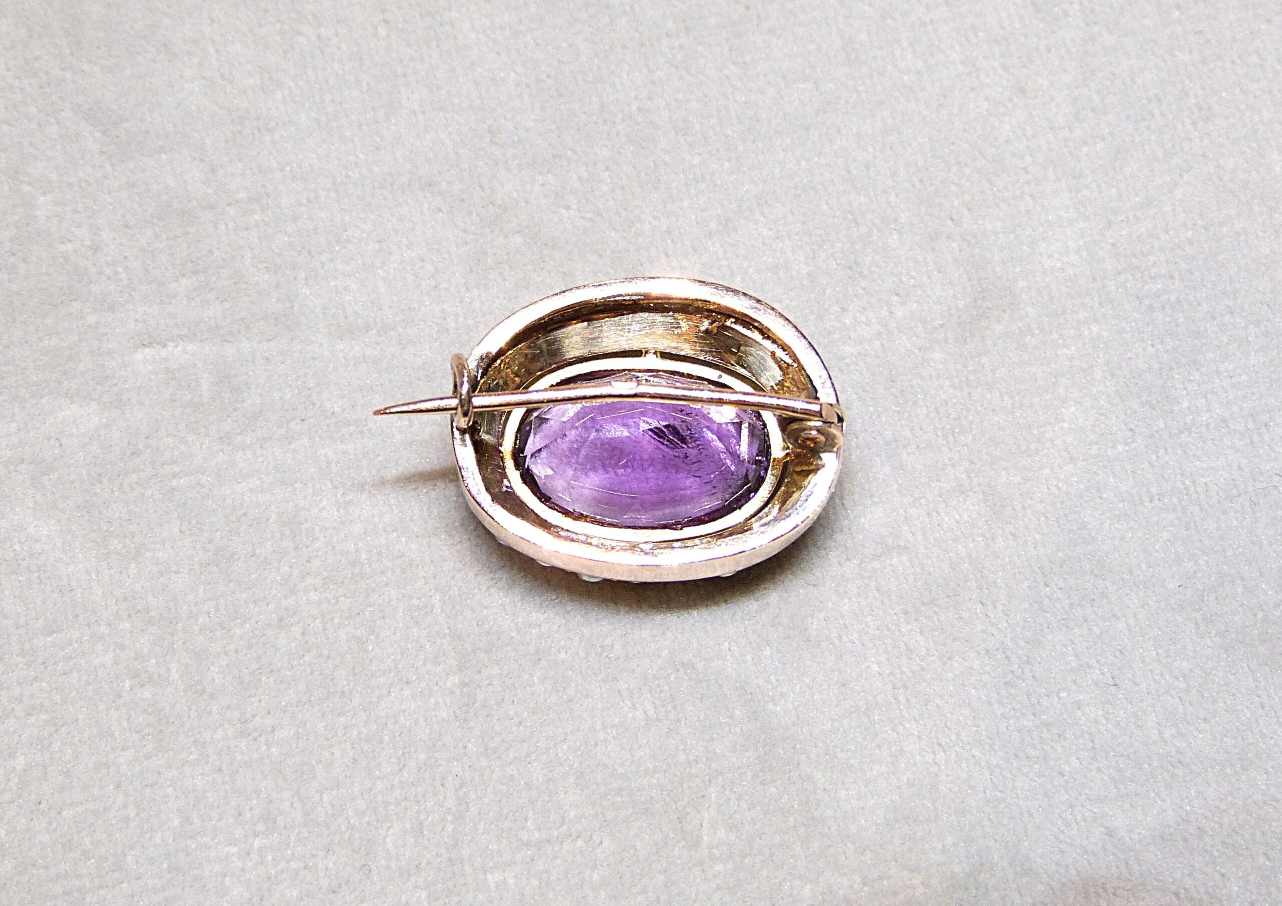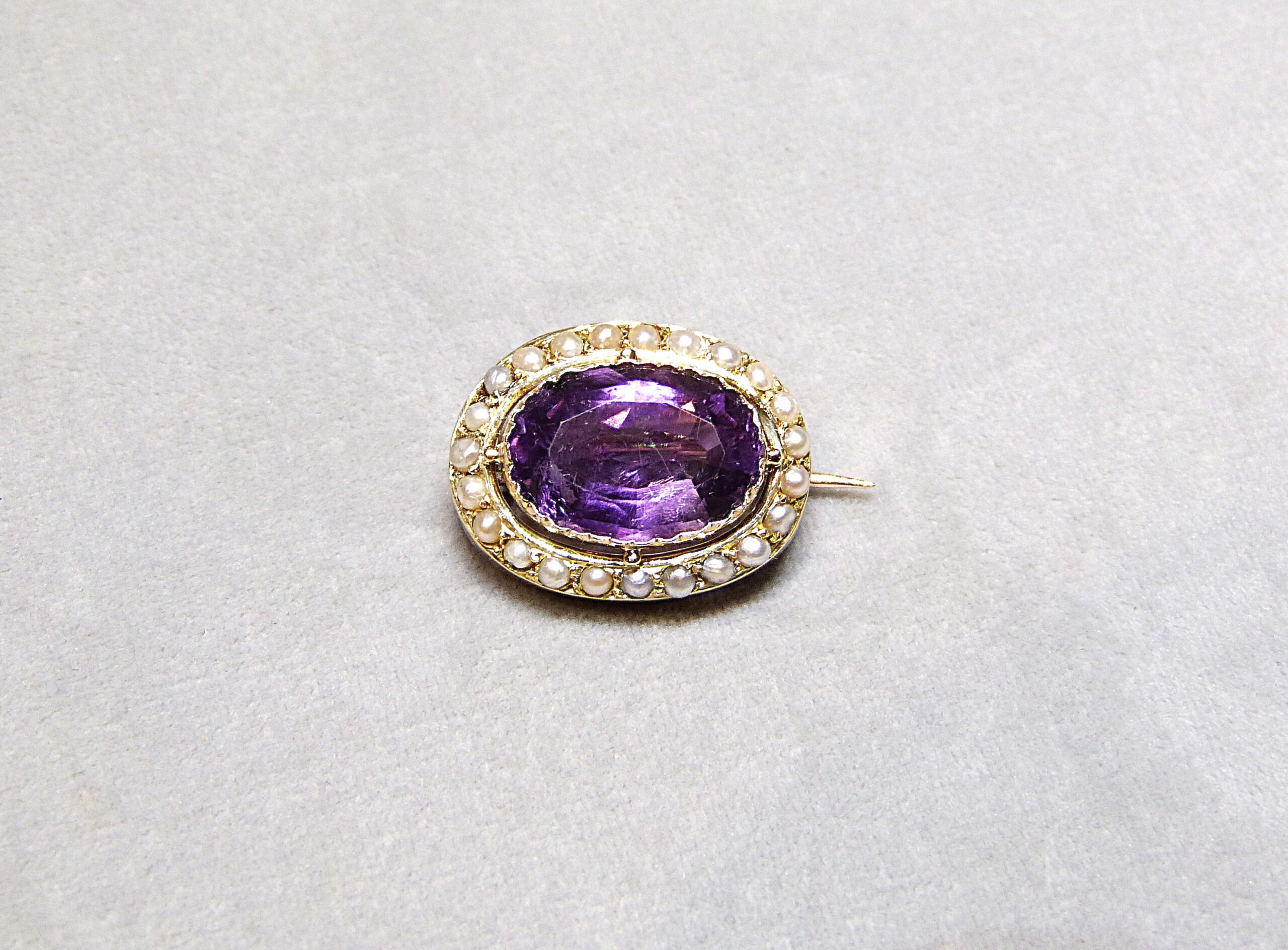 Broche ovale en or jaune 375/1000ème ( 9 k ) sertie en son centre d’une améthyste ovale entourées de demi-perles fines.