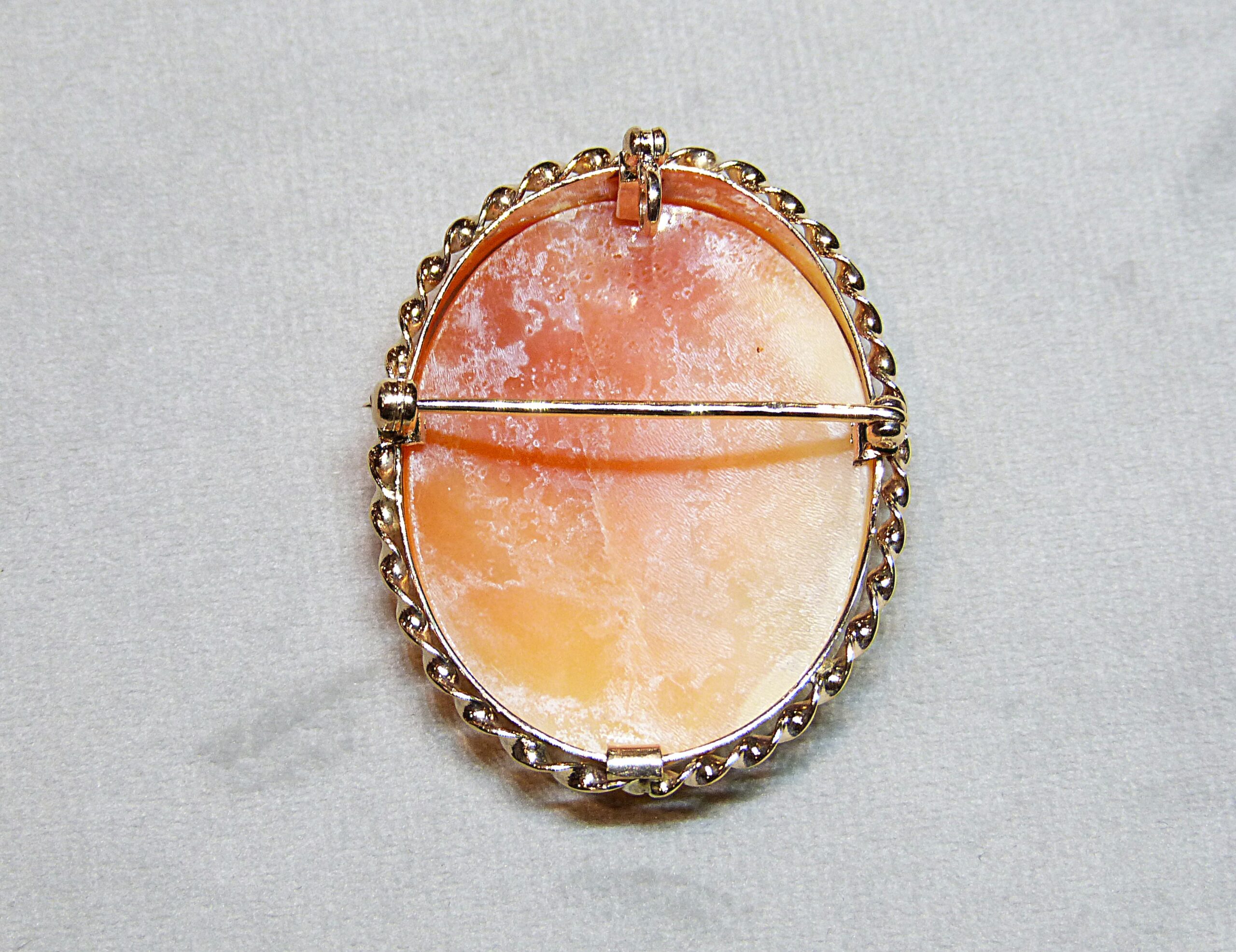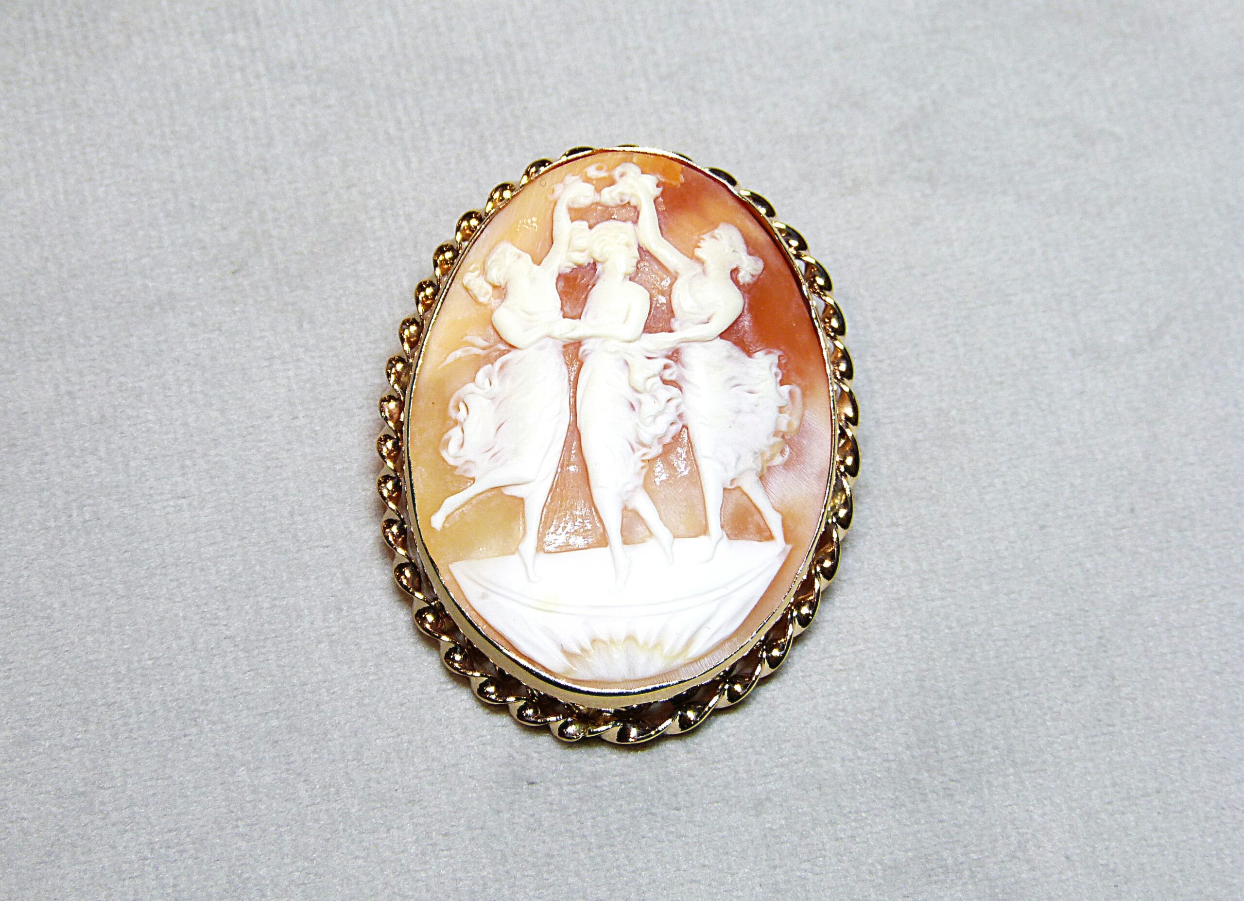 Broche formant pendentif en or jaune 585/1000ème ( 14 k ) torsadé sertie d’un camée sur coquillage représentant les 3 Grâces.