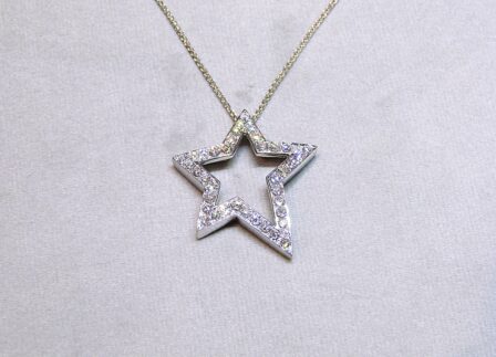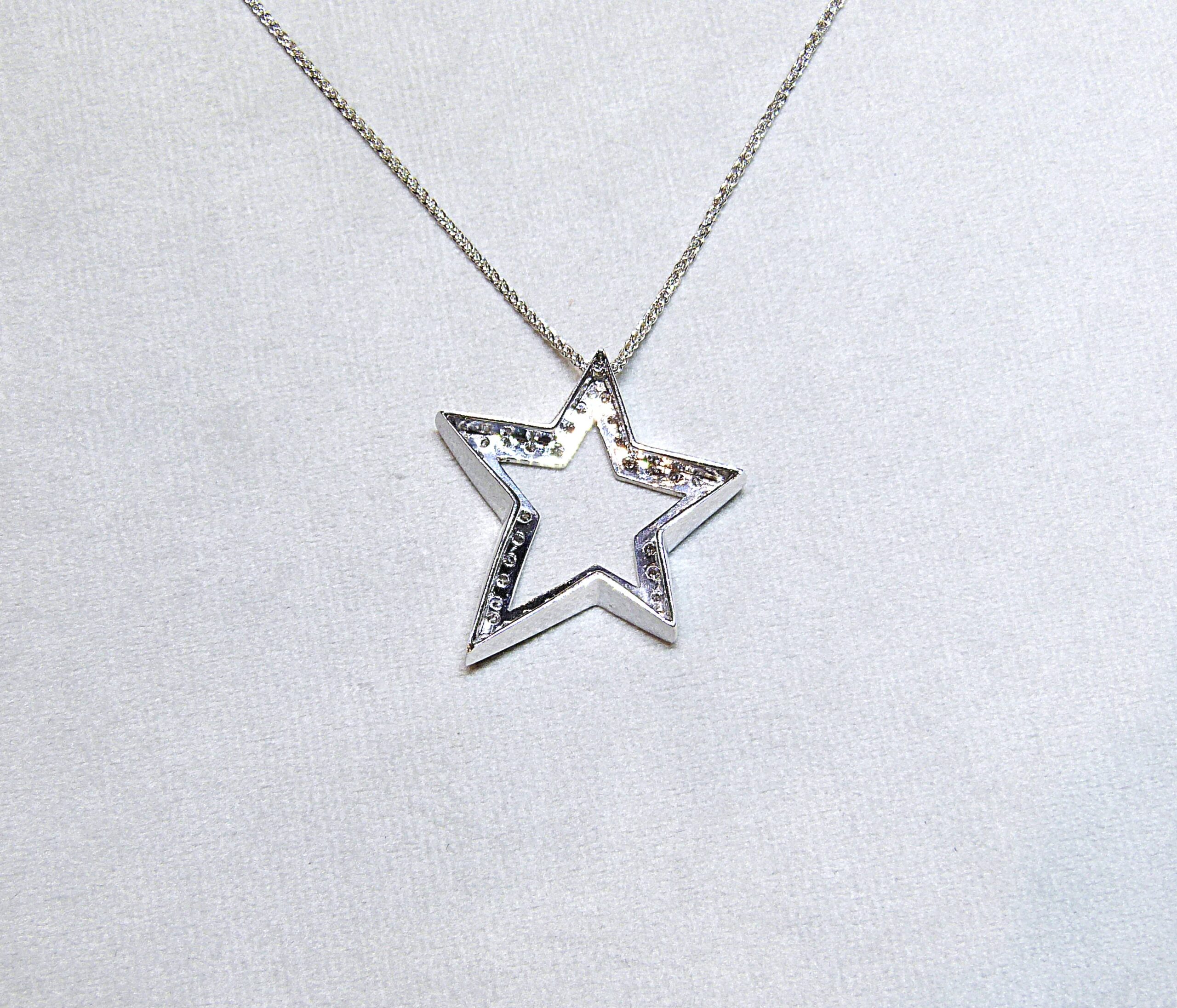 Collier en or gris 750/1000ème ( 18 k ) maille fantaisie retenant en pendentif une étoile sertie de 41 diamants taille brillant pesant ensemble 2 carats environ.