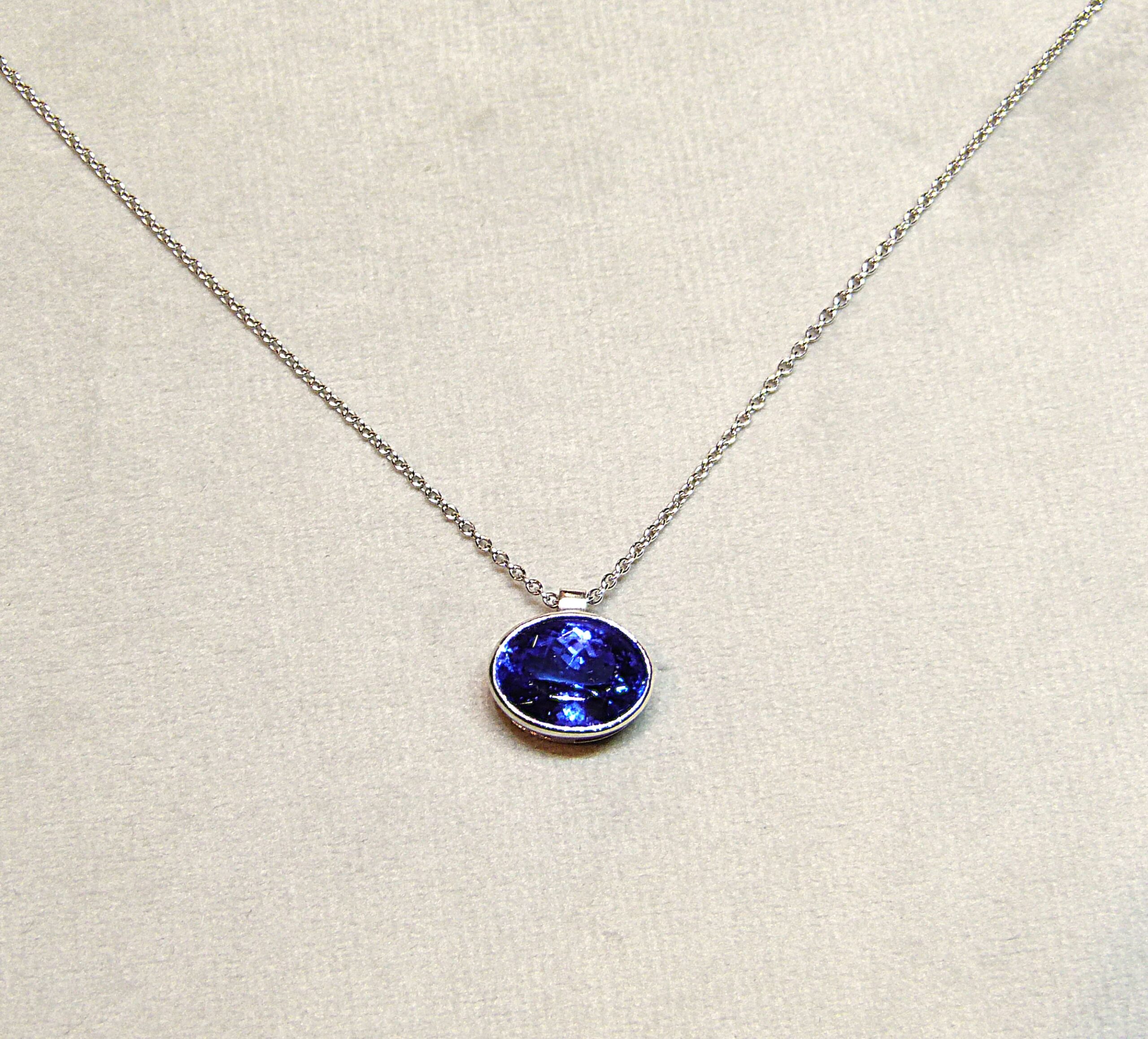 Collier en or gris 750/1000ème ( 18 k ) maille forçat ronde retenant en pendentif une tanzanite ovale pesant 4,41 carats.
