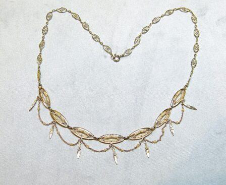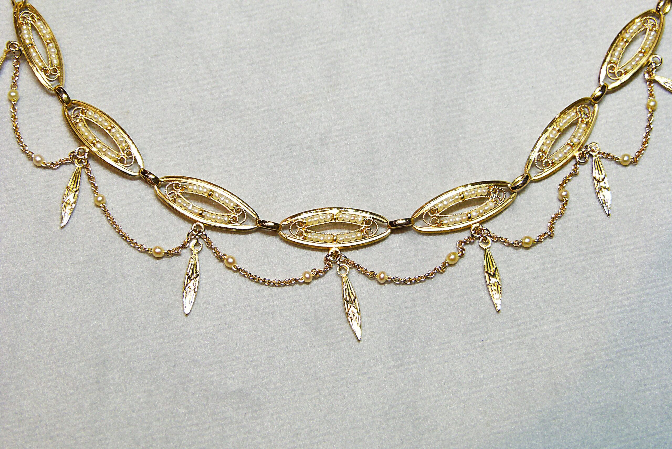 Collier draperie en or jaune 750/1000ème ( 18 k ) à mailles olive filigranées ornées de petites perles fines.
