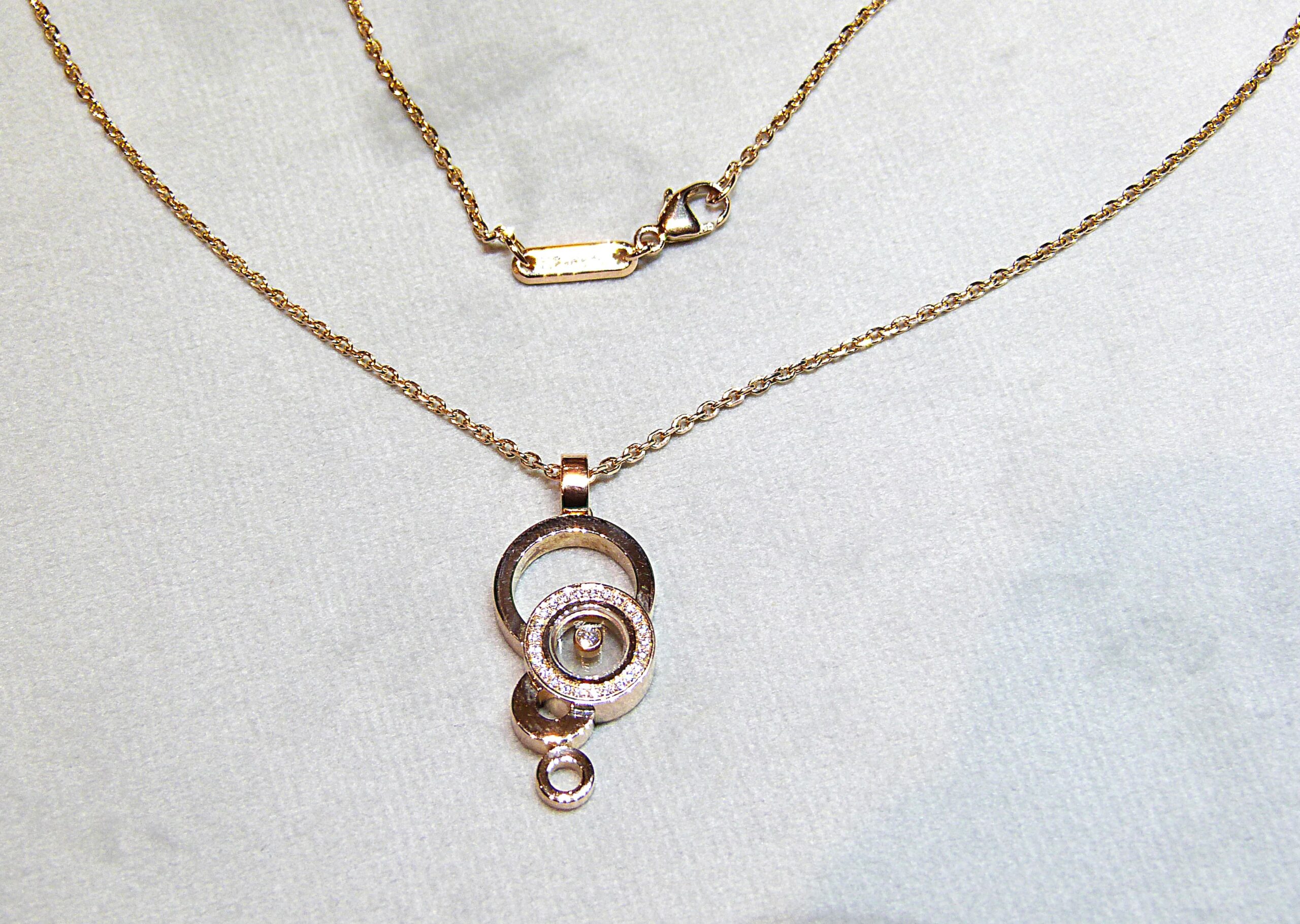 Collier en or rose 750/1000ème ( 18 k ) retenant un pendentif à motif de disques ajourés sertis de diamants pesant ensemble 0,15 carat.