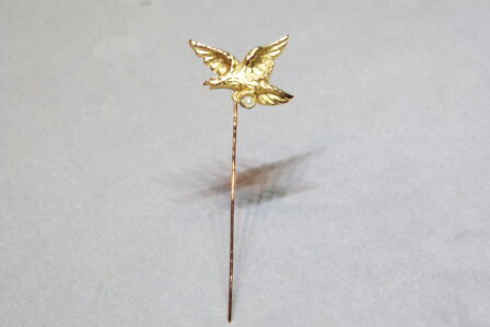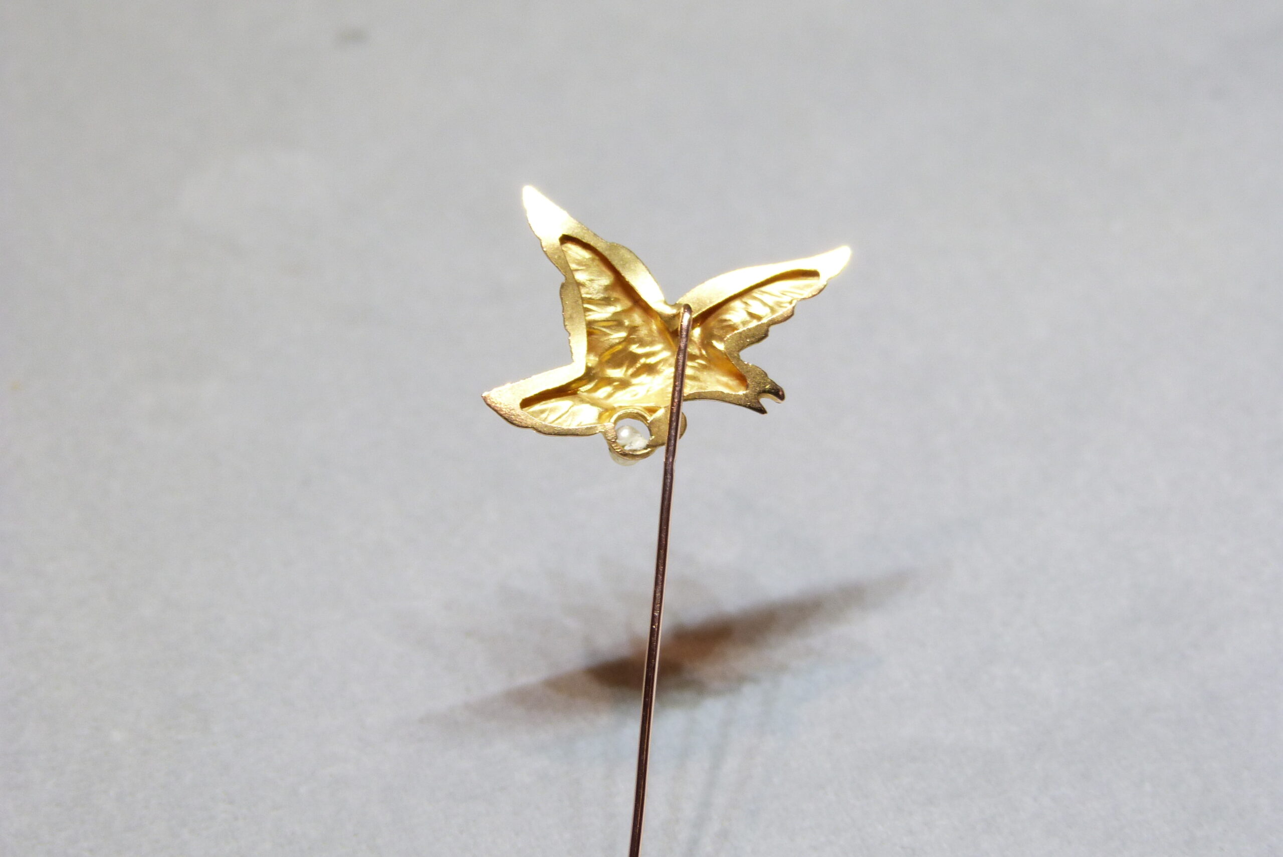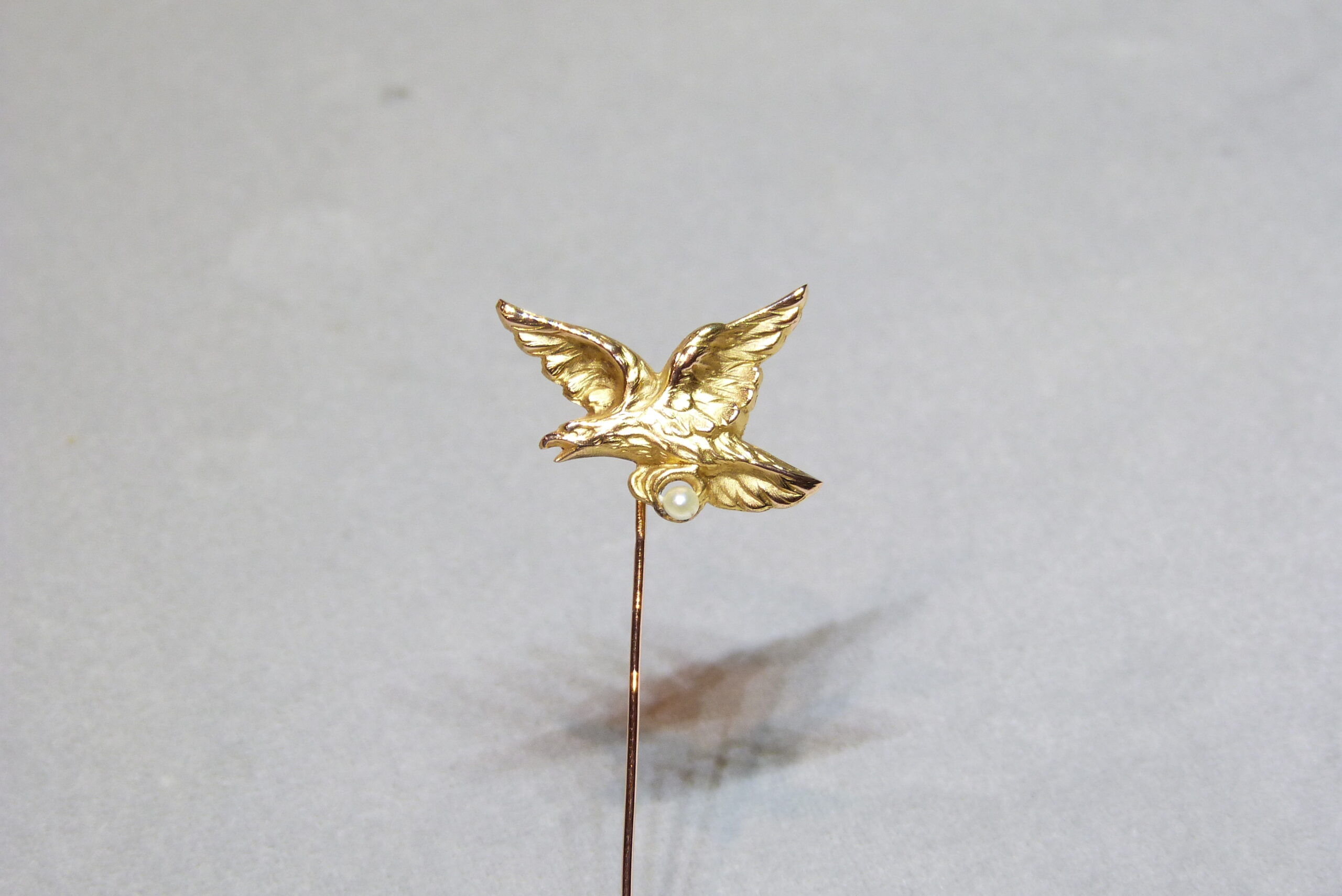 Epingle à cravate en or jaune 750/1000ème ( 18 k ) à décor d’aigle ciselé tenant dans son bec une perle fine.