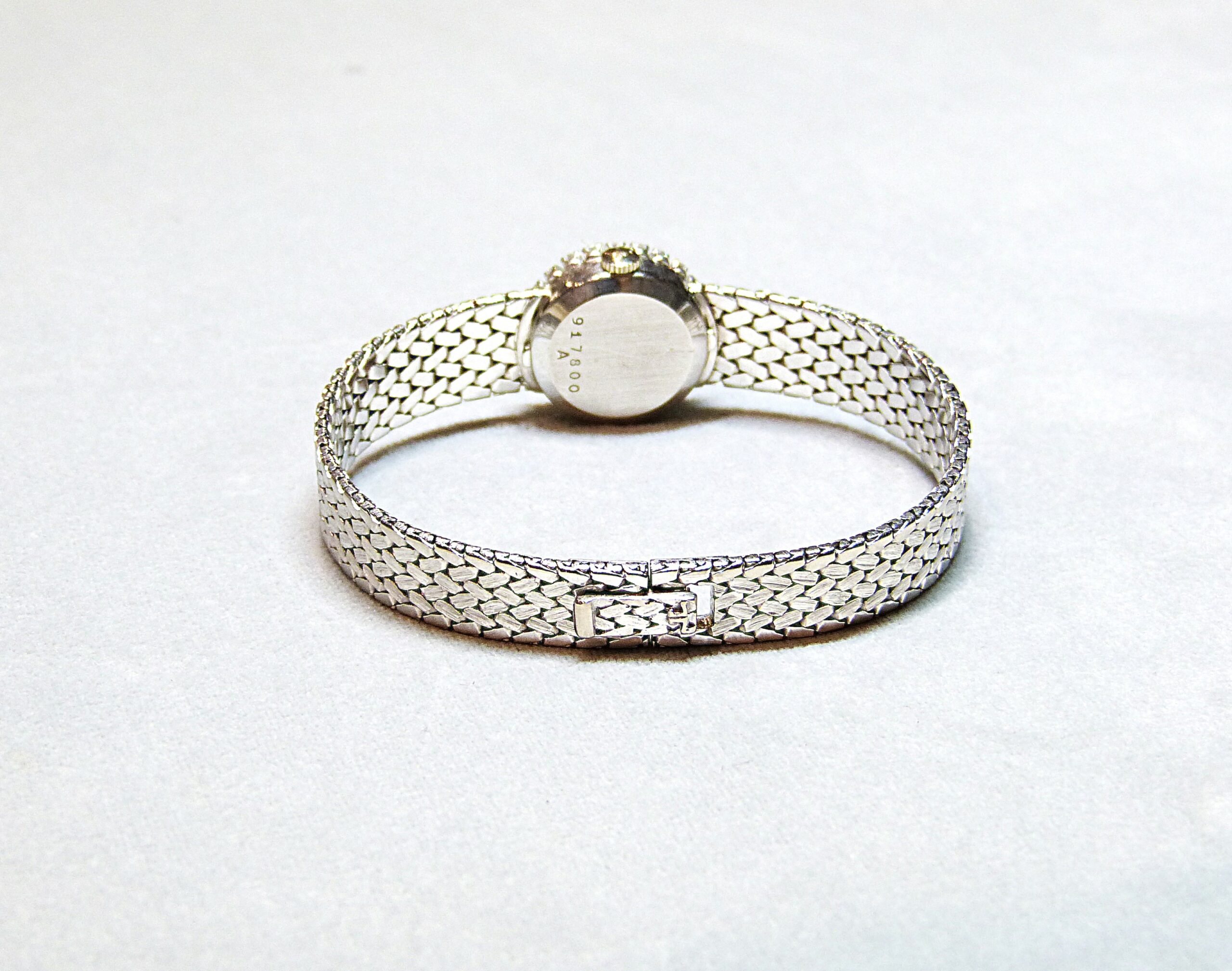 Montre-bracelet de dame en or gris 750/1000ème ( 18 k ), cadran rond à fond nacré, index bâtons, lunette sertie de diamants taille brillant pesant ensemble 0,48 carat environ, bracelet en or gris tressé, mouvement mécanique.