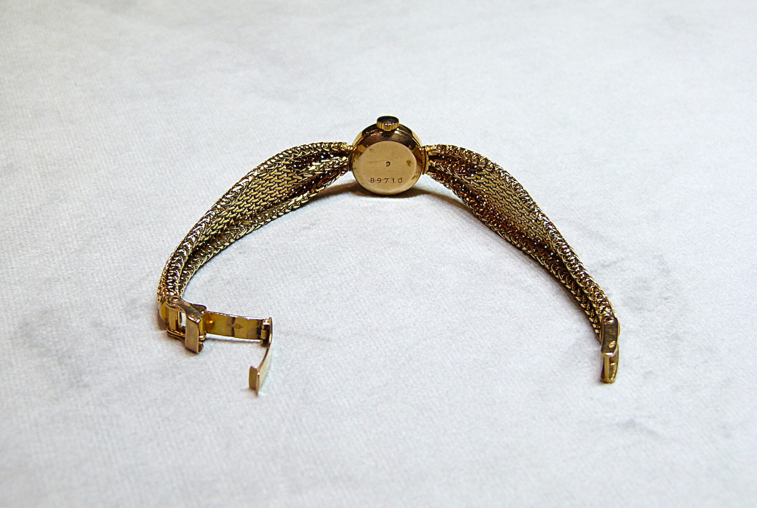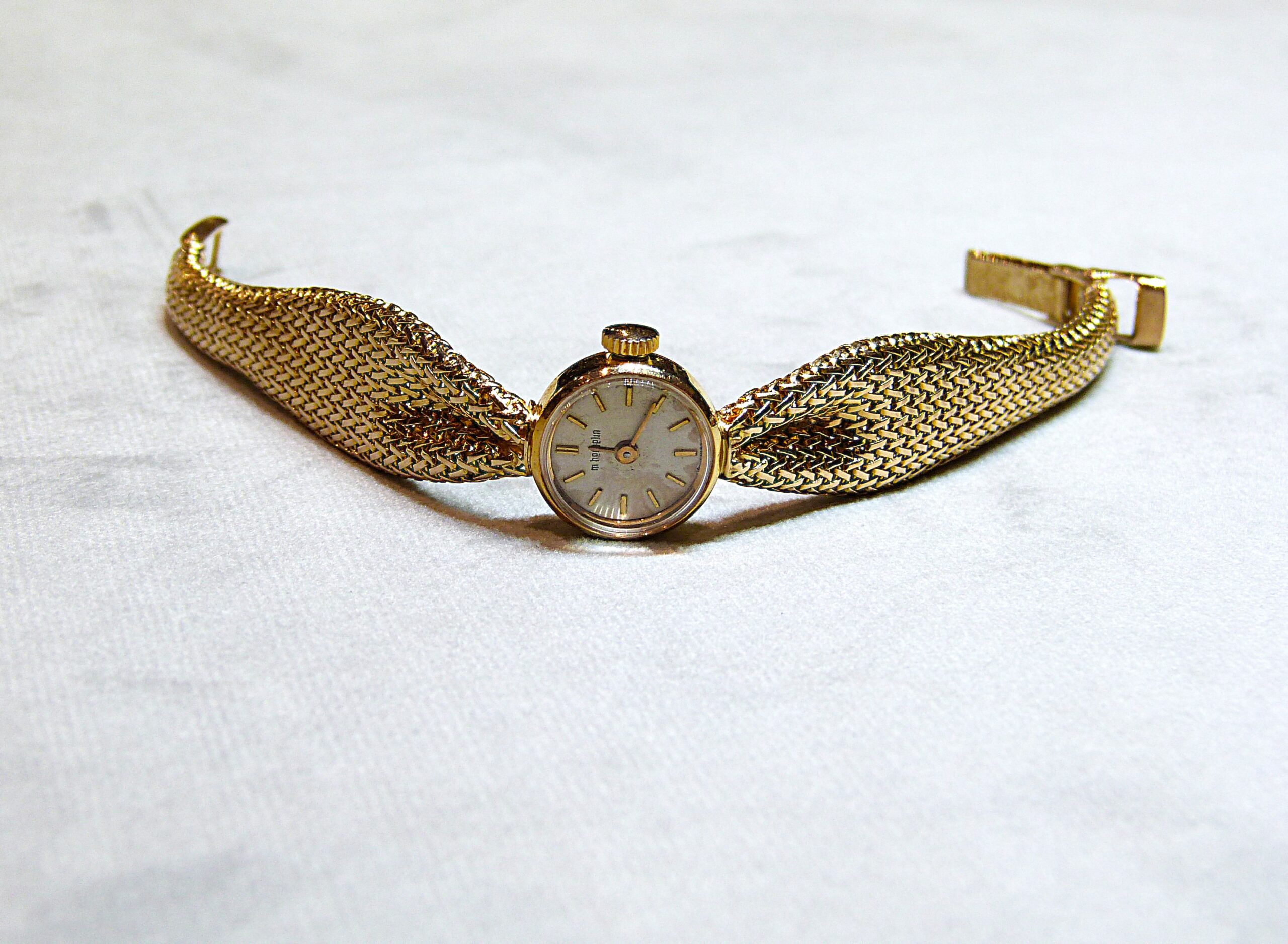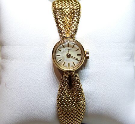 Montre-bracelet de dame en or jaune 750/1000ème ( 18 k ), cadran rond à fond champagne, index bâtons, bracelet ruban cintré en or tissé, mouvement mécanique.