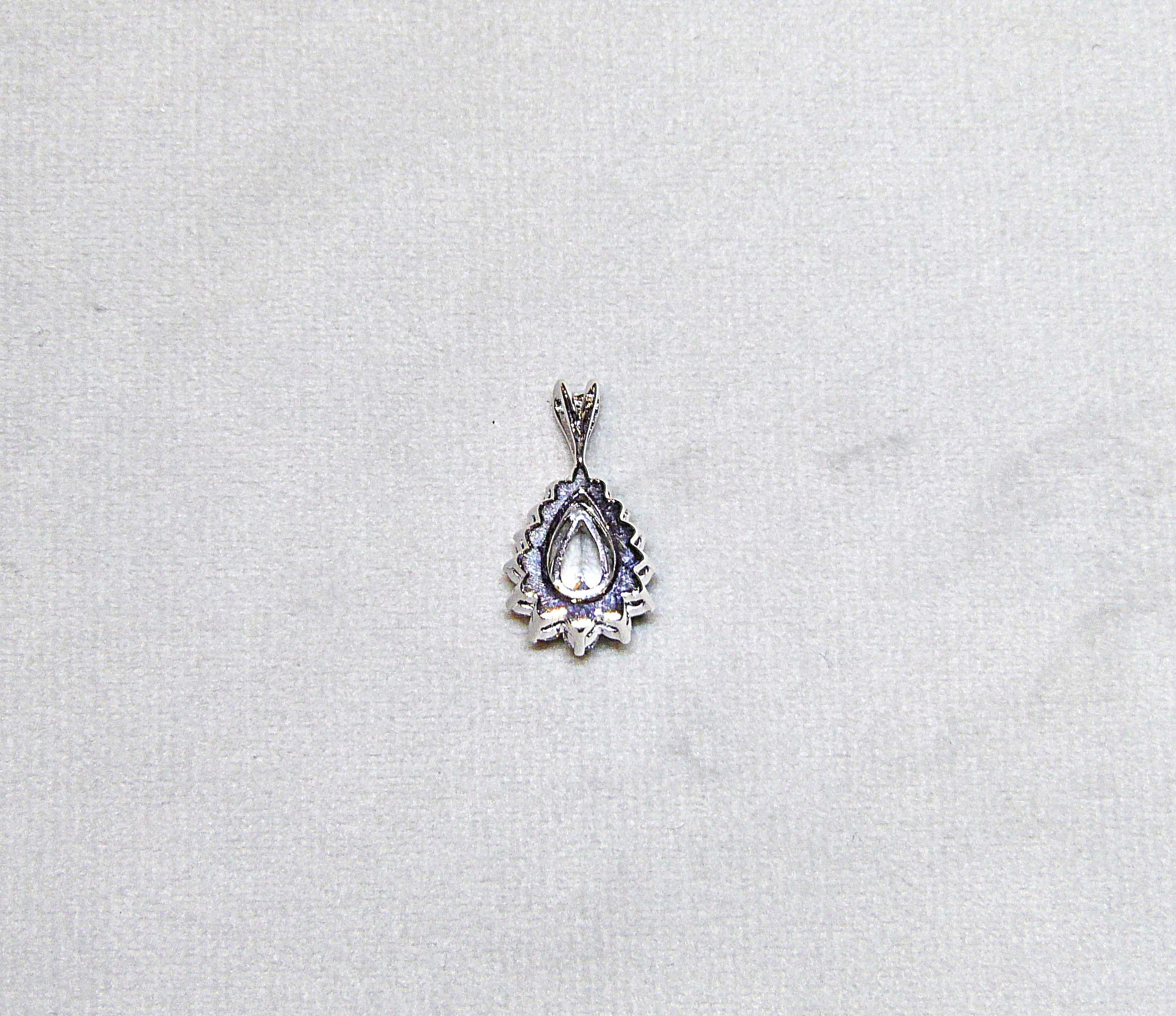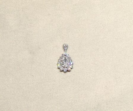 Pendentif en or gris 750/1000ème ( 18 k ) serti d’un diamant taille poire pesant 0,78 carat, couleur E, pureté VS2 entouré de diamants taille brillant pesant ensemble 0,54 carat environ.