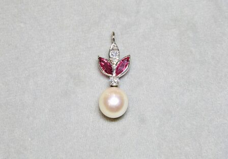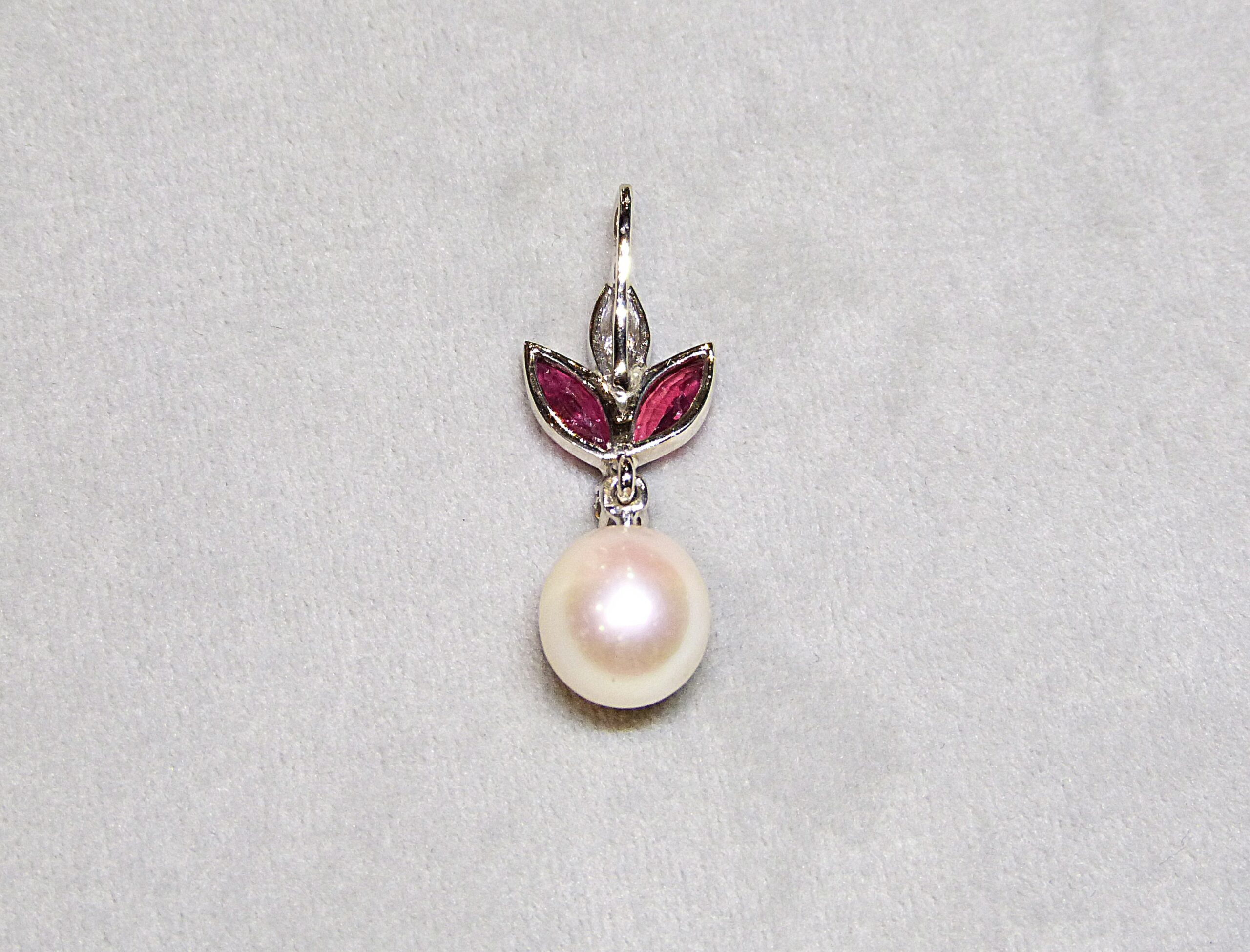 Pendentif en or gris 750/1000ème ( 18 k ) serti d’une perle de culture poire de dimension 10 x 9 mm surmontée de deux rubis taille navette pesant chacun 0,30 carat environ et de deux diamants taille brillant de 0,10 et 0,05 carat.