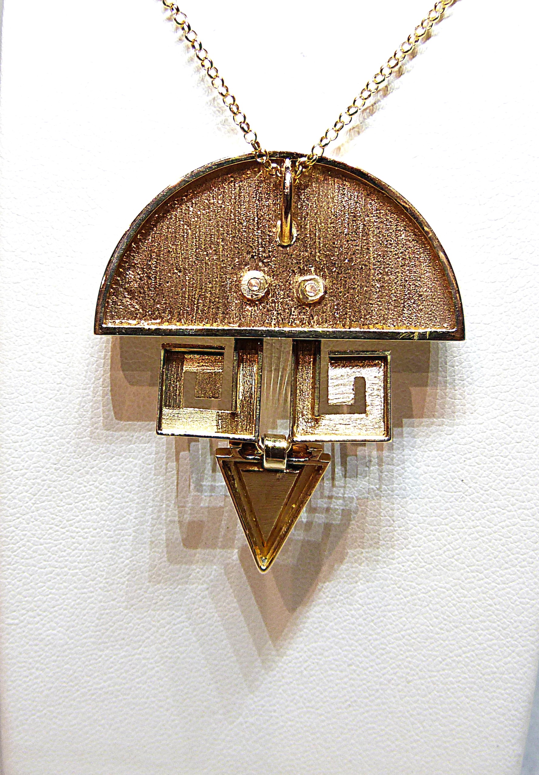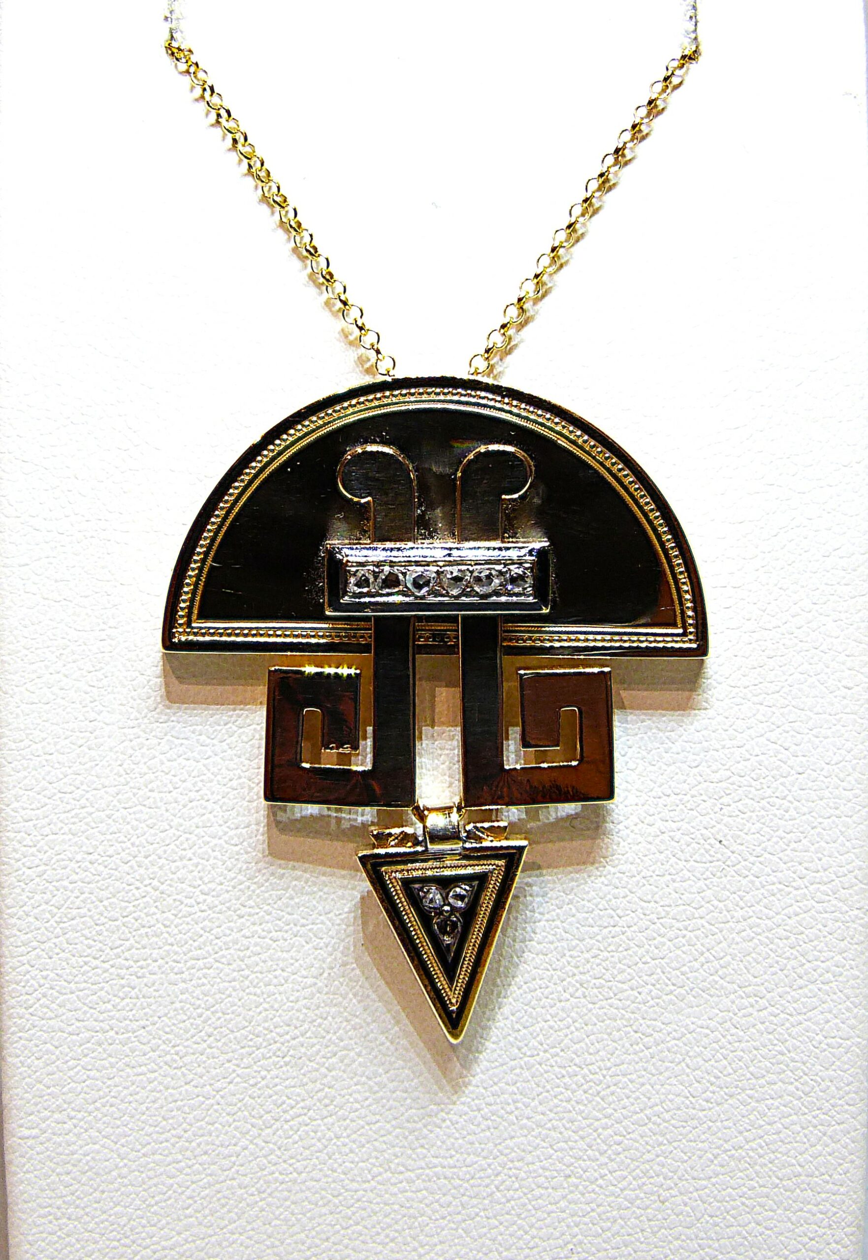 Pendentif demi-lune de forme géométrique en or jaune 750/1000ème ( 18 k ) à décor de grecque sertie de diamants taille rose sur émail noir.