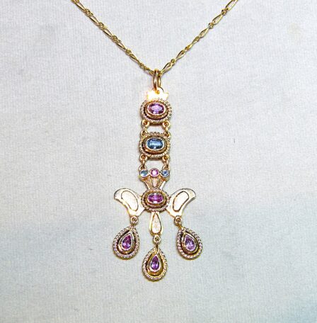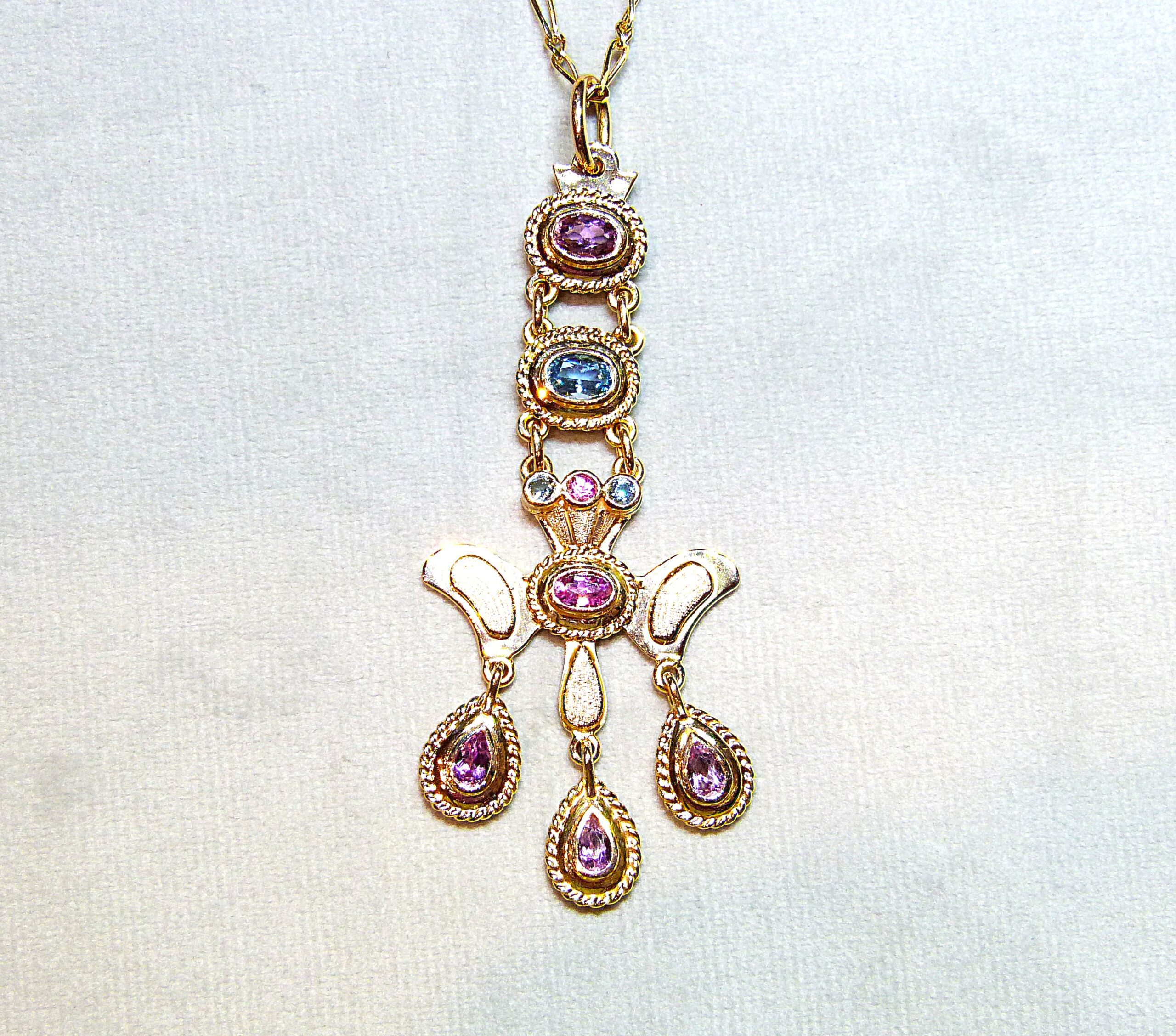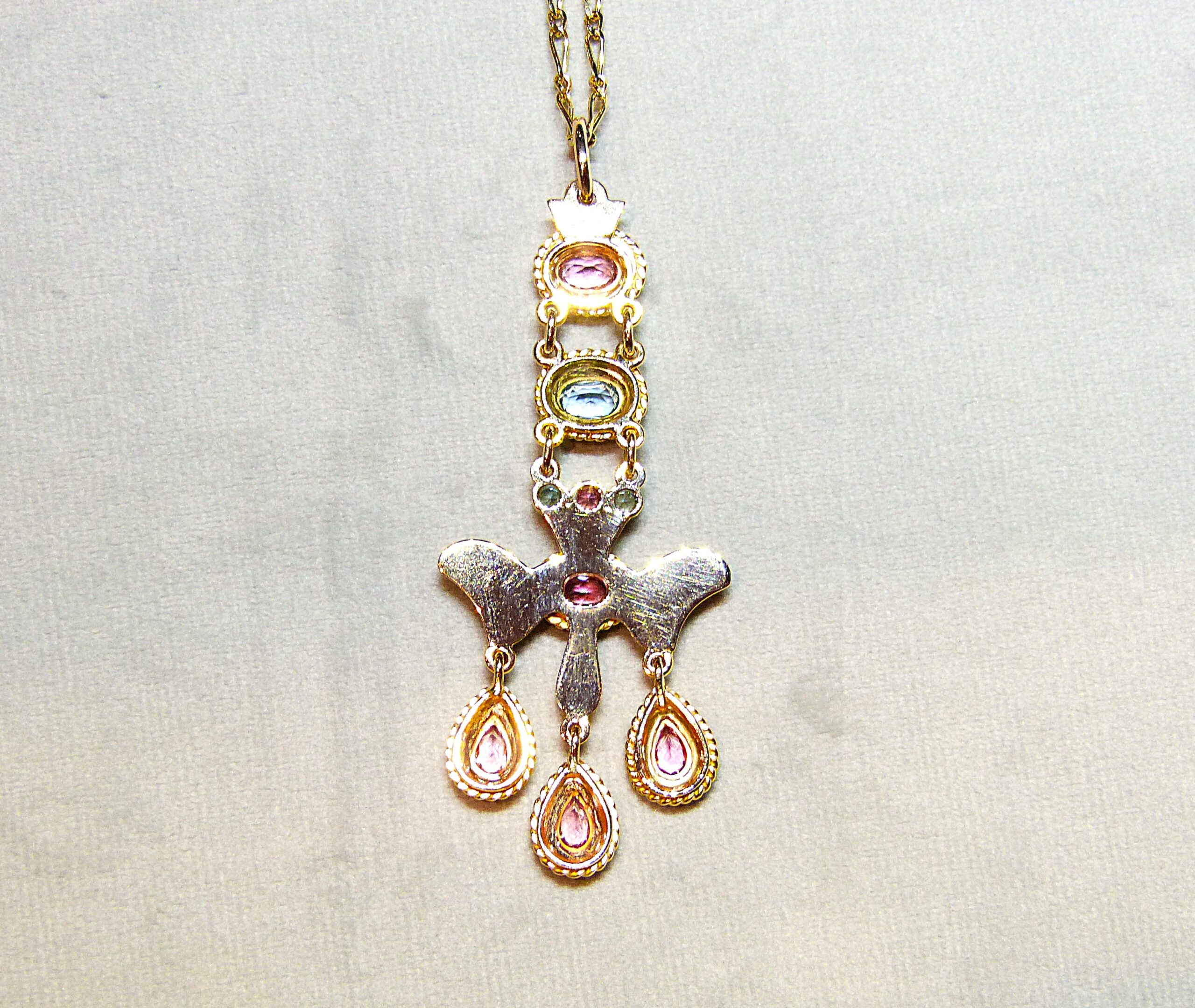 Pendentif en forme de colombe Saint-Esprit en or jaune 750/1000ème ( 18 k ) sertie de tourmalines roses et d’aigue-marines.
