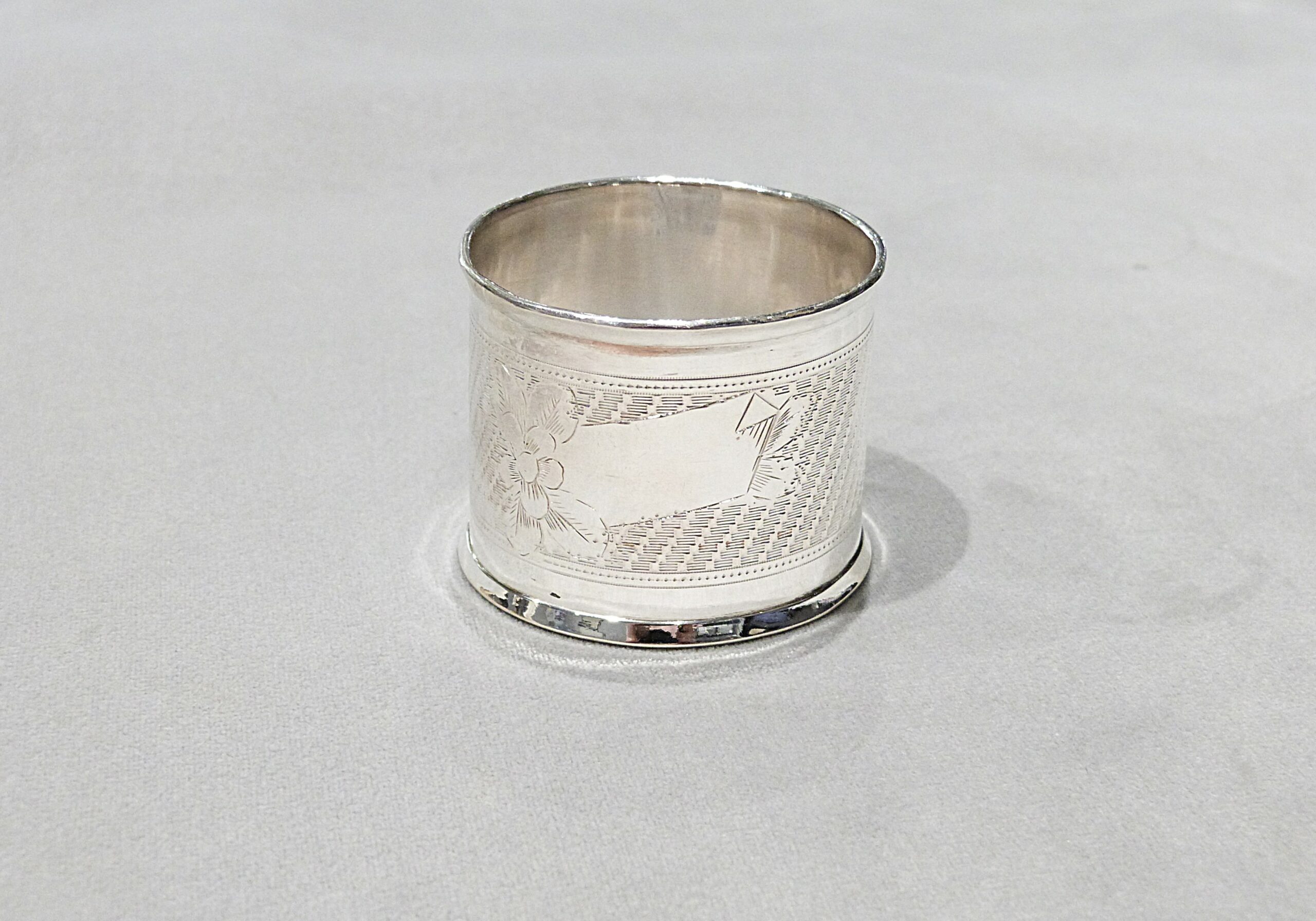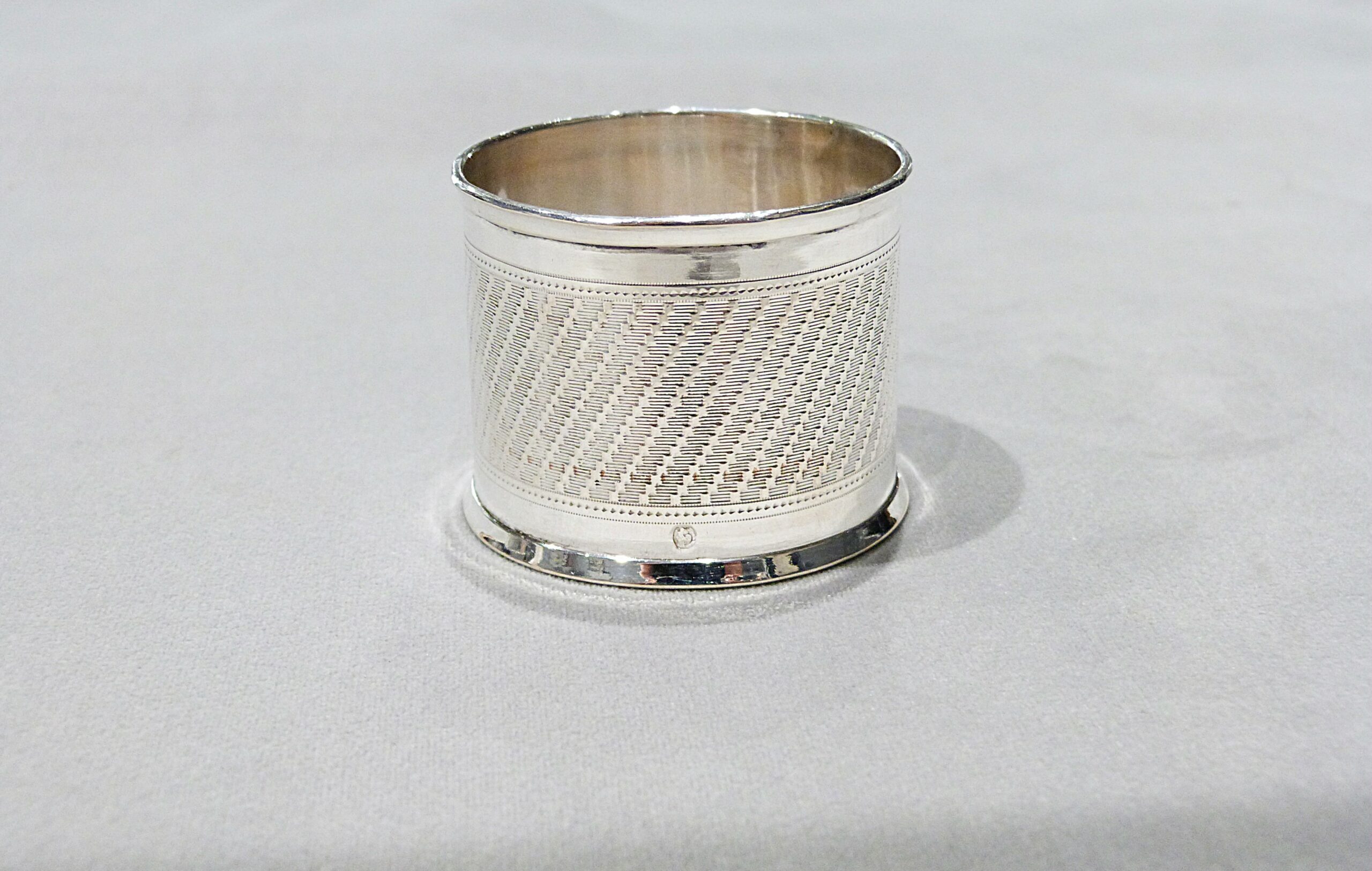 Rond de serviette en argent 950/1000eme guilloché à décor fleuri et de cartouche.